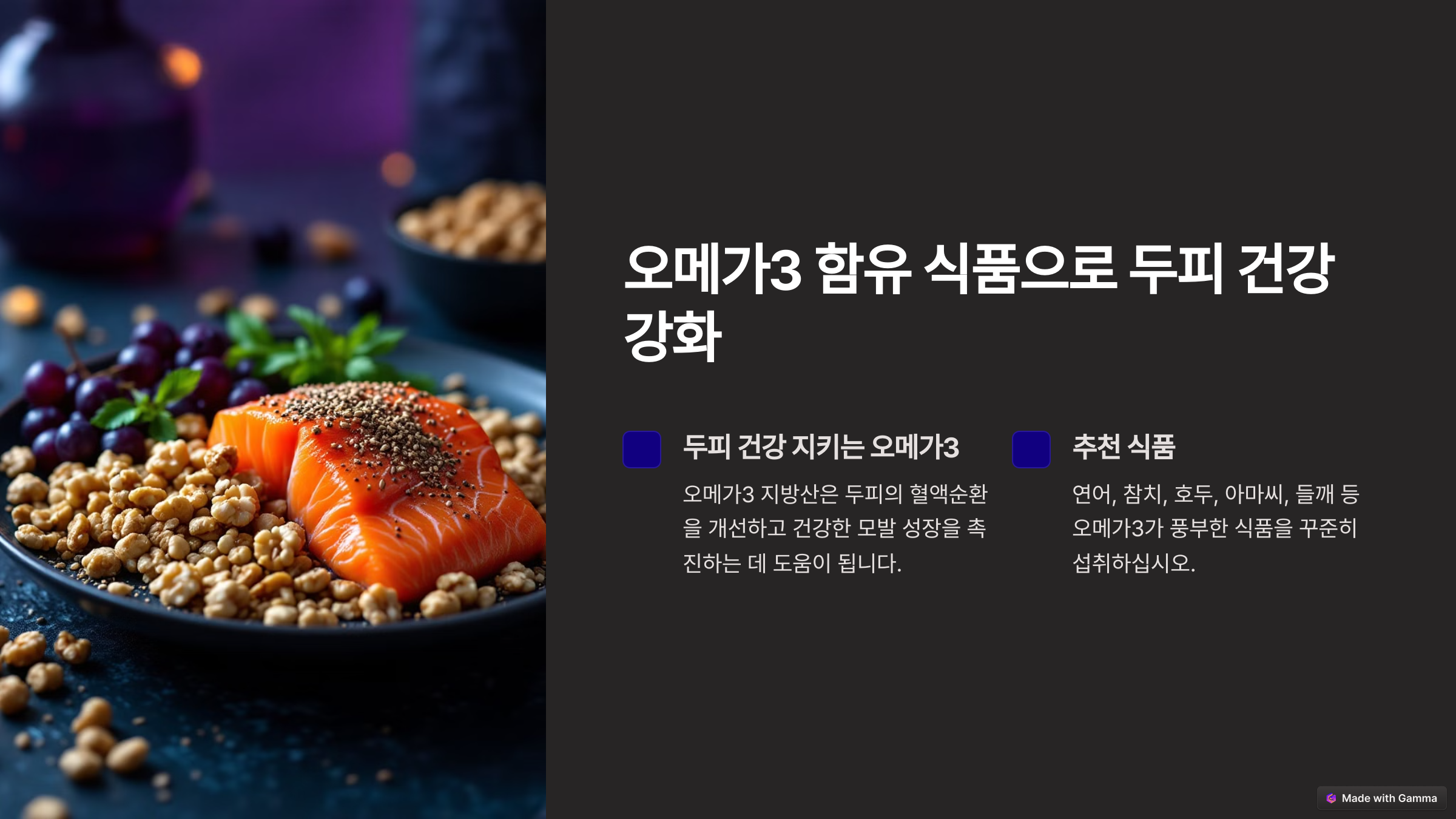 오메가3 지방산은 두피에 영양을 공급하고 염증을 줄여 건강한 모발 성장을 돕는 필수 영양소예요.