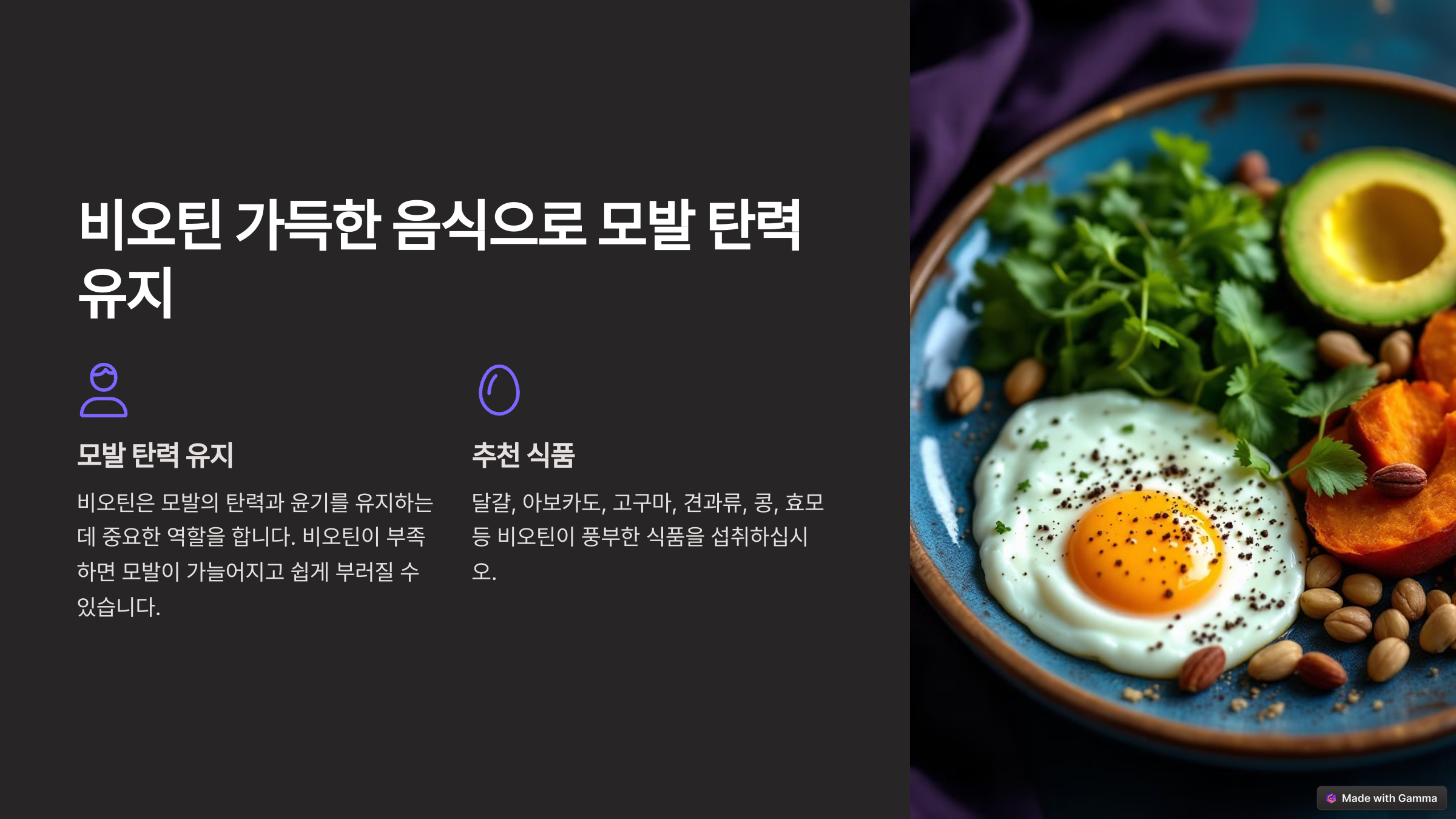 비오틴(비타민 B7)은 머리카락의 성장과 탄력을 유지하는 필수 영양소예요. 비오틴이 부족하면 머리카락이 가늘어지고 잘 빠질 수 있어요.
