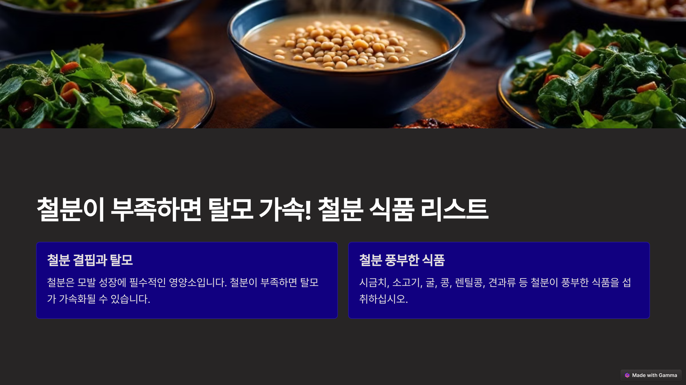 철분이 부족하면 산소 공급이 원활하지 않아 모발이 약해지고 탈모가 심해질 수 있어요.