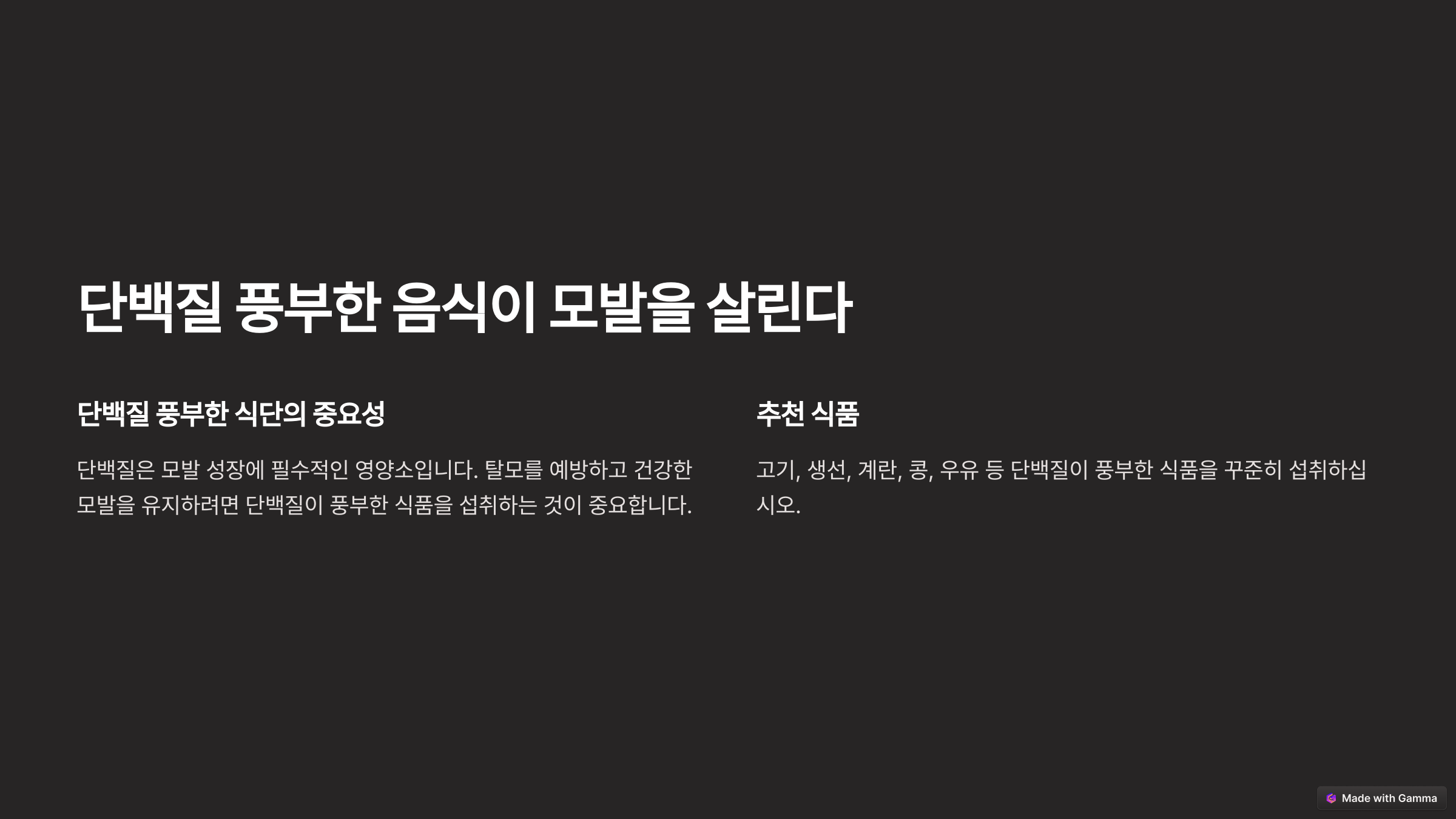 - 🥩 닭가슴살 – 지방은 적고 단백질 함량이 높아 모발 건강에 좋아요