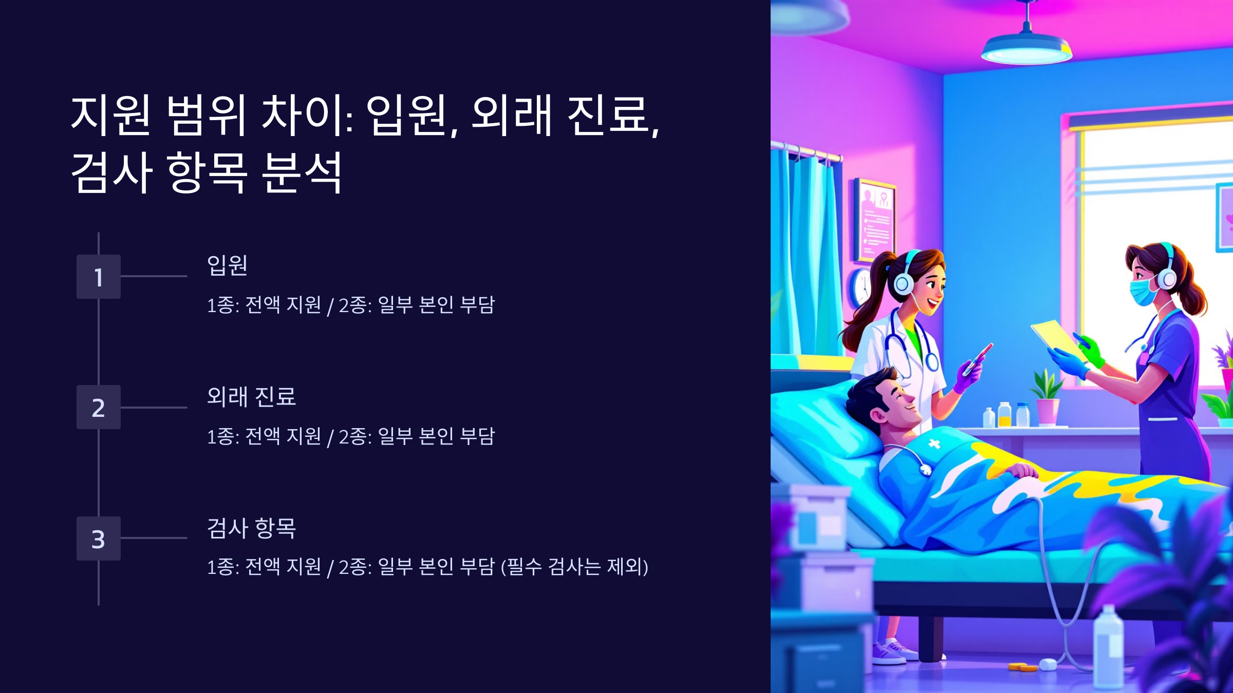 의료급여 1종은 입원비와 외래 진료가 무료지만, 2종은 일부 본인 부담이 있어요. 특히 CT·MRI 같은 고가 검사에서는 차이가 크니 확인하는 것이 좋아요.