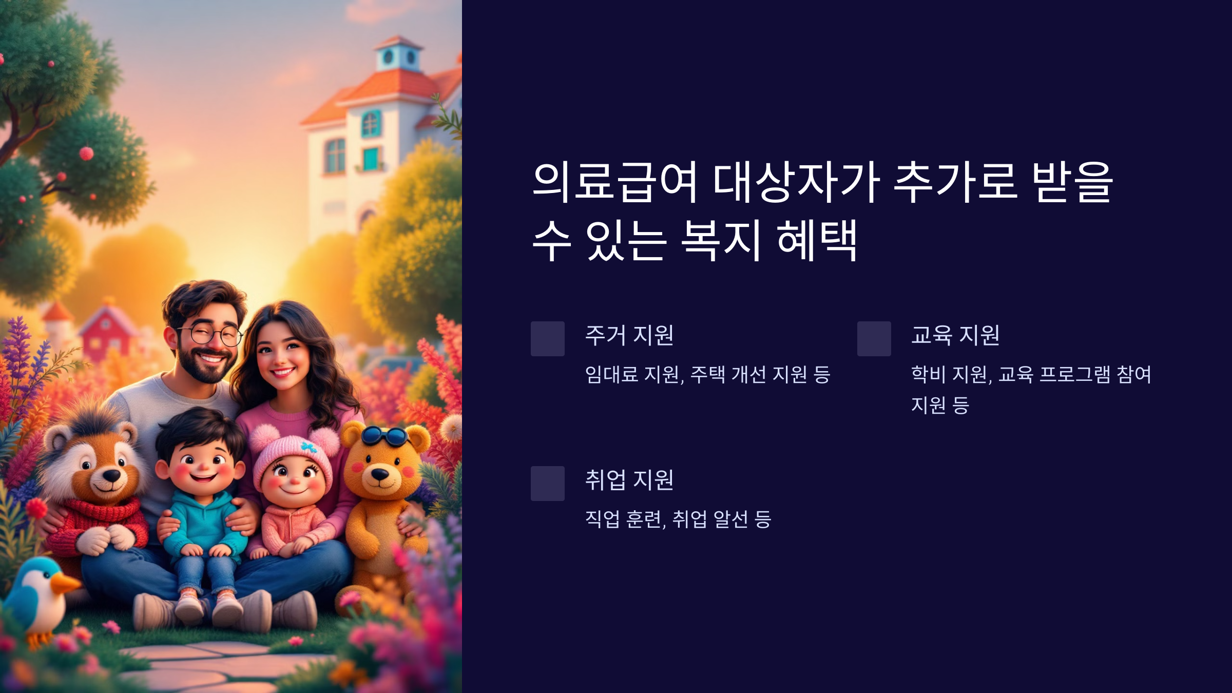 의료급여 대상자는 병원비 지원 외에도 다양한 추가 복지 혜택을 받을 수 있어요.