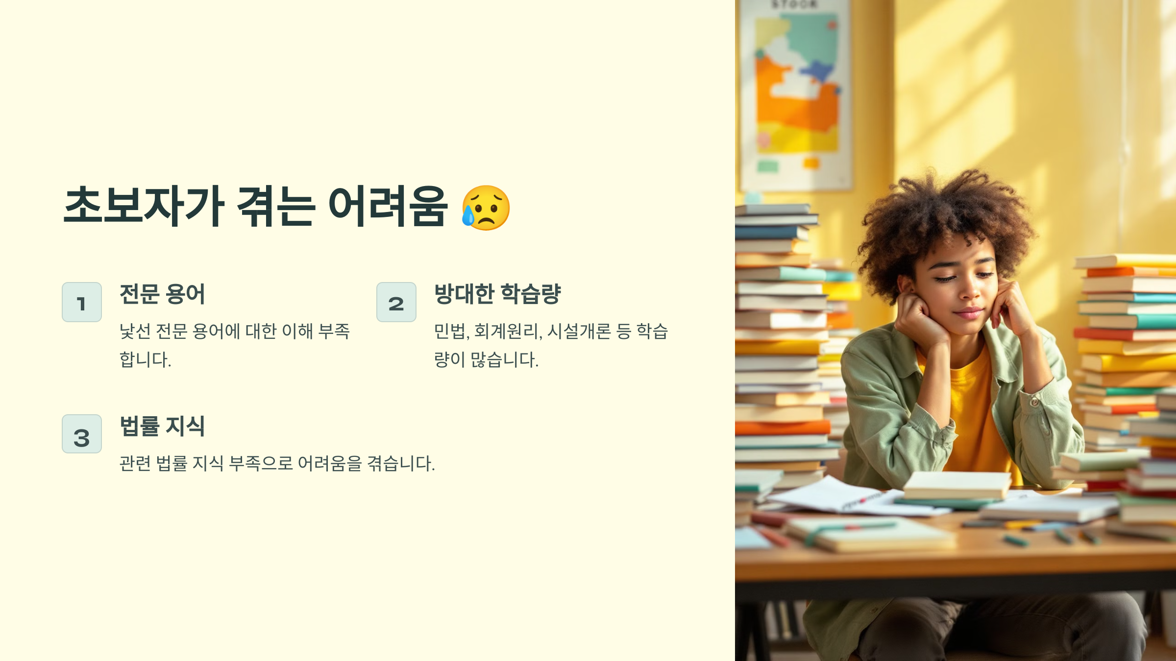 특히 과목별 난이도 차이가 크고, 법률과 회계 같은 생소한 내용이 많아서 초보자가 접근하기 어려울 수 있어요. 하지만 꾸준한 학습과 실전 연습이 합격의 핵심이에요.