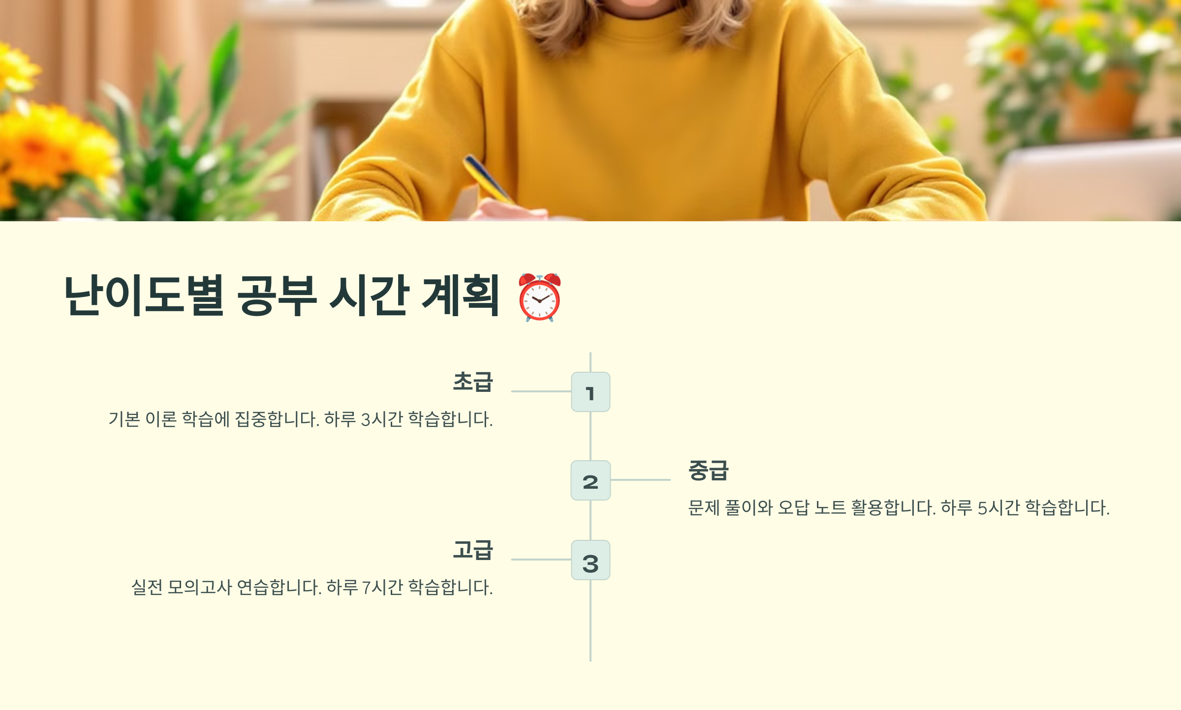 A5. 평일 3~4시간, 주말 6~8시간 정도 공부하는 것이 이상적이에요. 직장인이라면 출퇴근 시간을 활용하는 것도 좋아요.