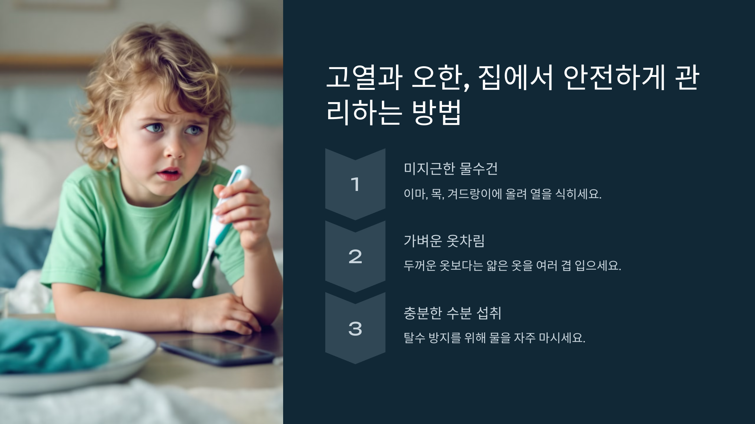 위 방법들을 잘 실천하면 고열과 오한을 효과적으로 조절할 수 있어요. 하지만, 3일 이상 고열이 지속되거나 숨쉬기 힘들 정도로 증상이 심해지면 반드시 병원을 방문해야 해요! 🏥