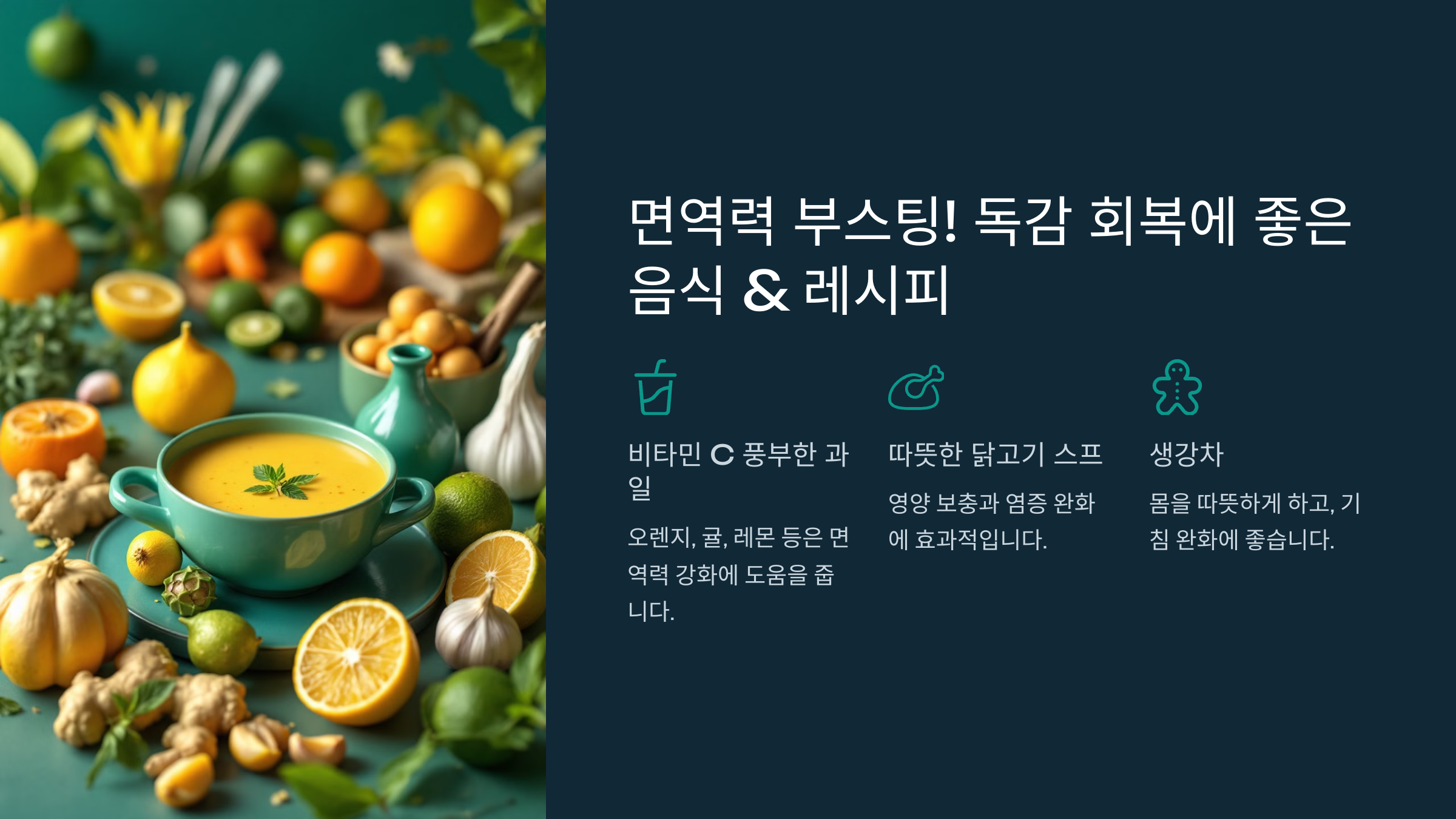 위에 나온 음식들을 잘 챙겨 먹으면 독감 회복이 훨씬 빨라질 거예요. 특히, 비타민C와 단백질이 풍부한 음식은 면역력을 높이는 데 필수적이니 신경 써서 섭취해 보세요! 💪
