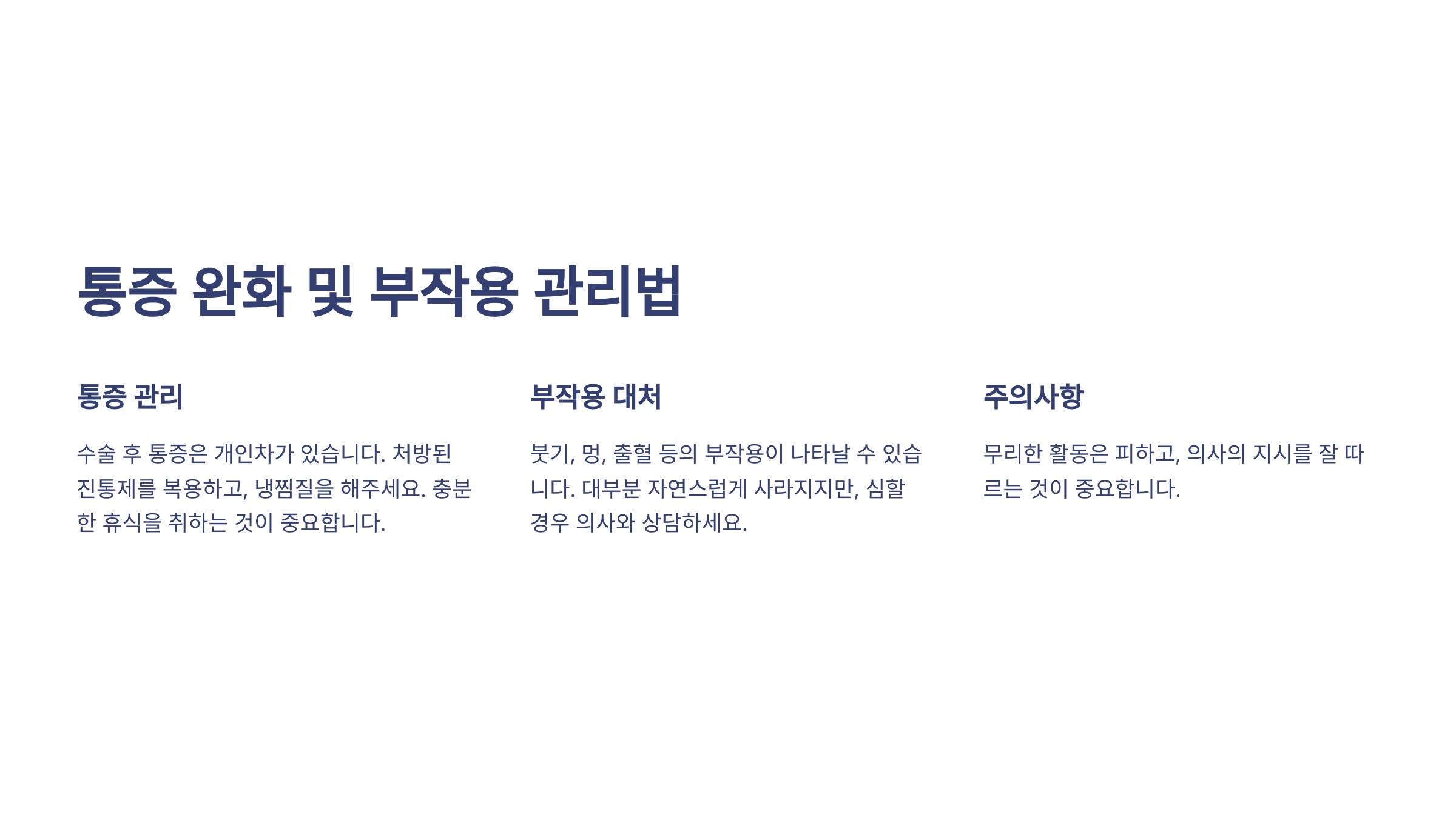 | 수술 직후 (1~2일) | 통증, 부기 | 냉찜질, 휴식 |