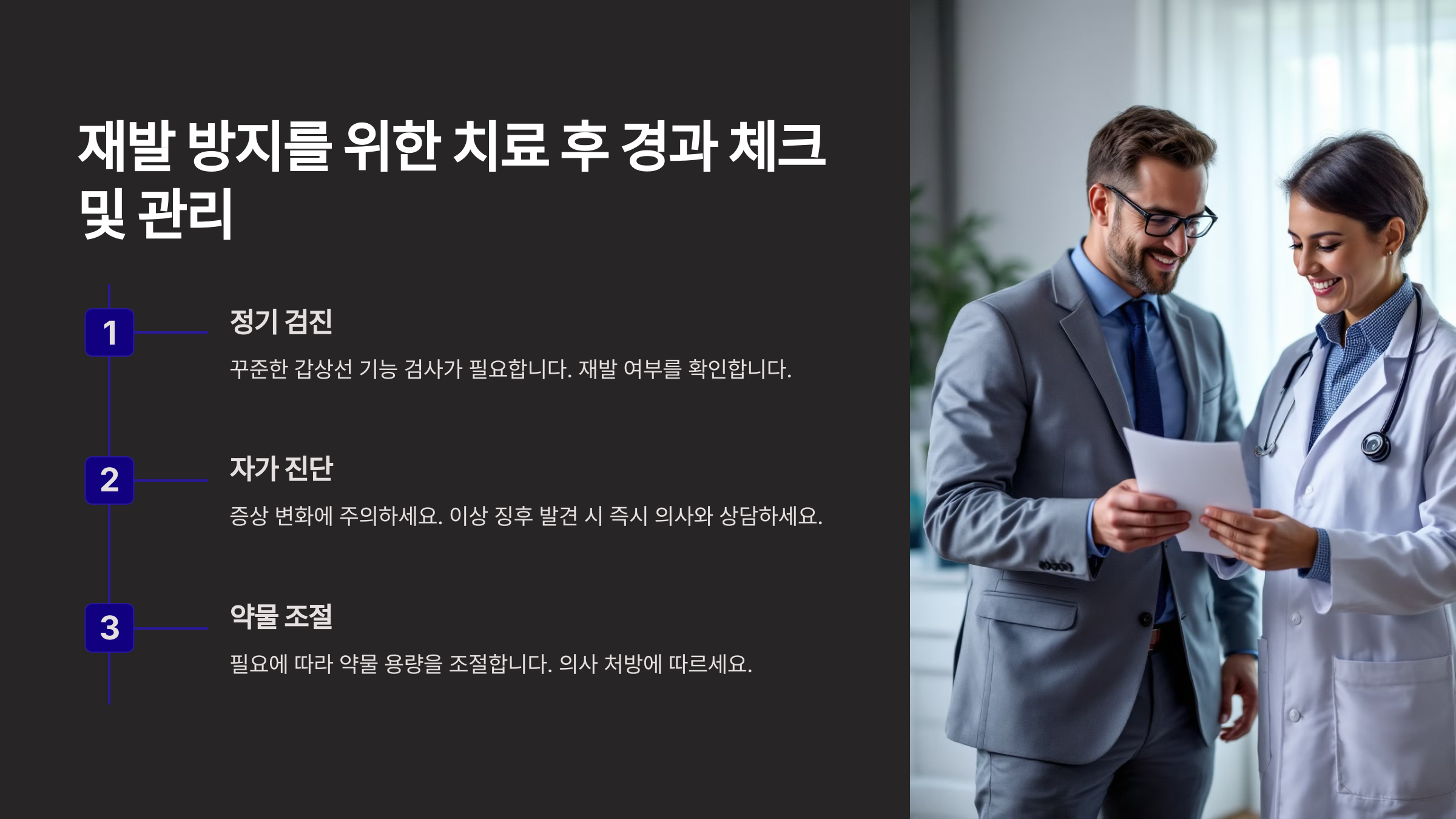 재발 여부를 확인하는 가장 좋은 방법은 정기적인 혈액 검사예요. 갑상선 호르몬(T3, T4)과 갑상선 자극 호르몬(TSH) 수치를 꾸준히 모니터링하면 재발 여부를 조기에 파악할 수 있어요.