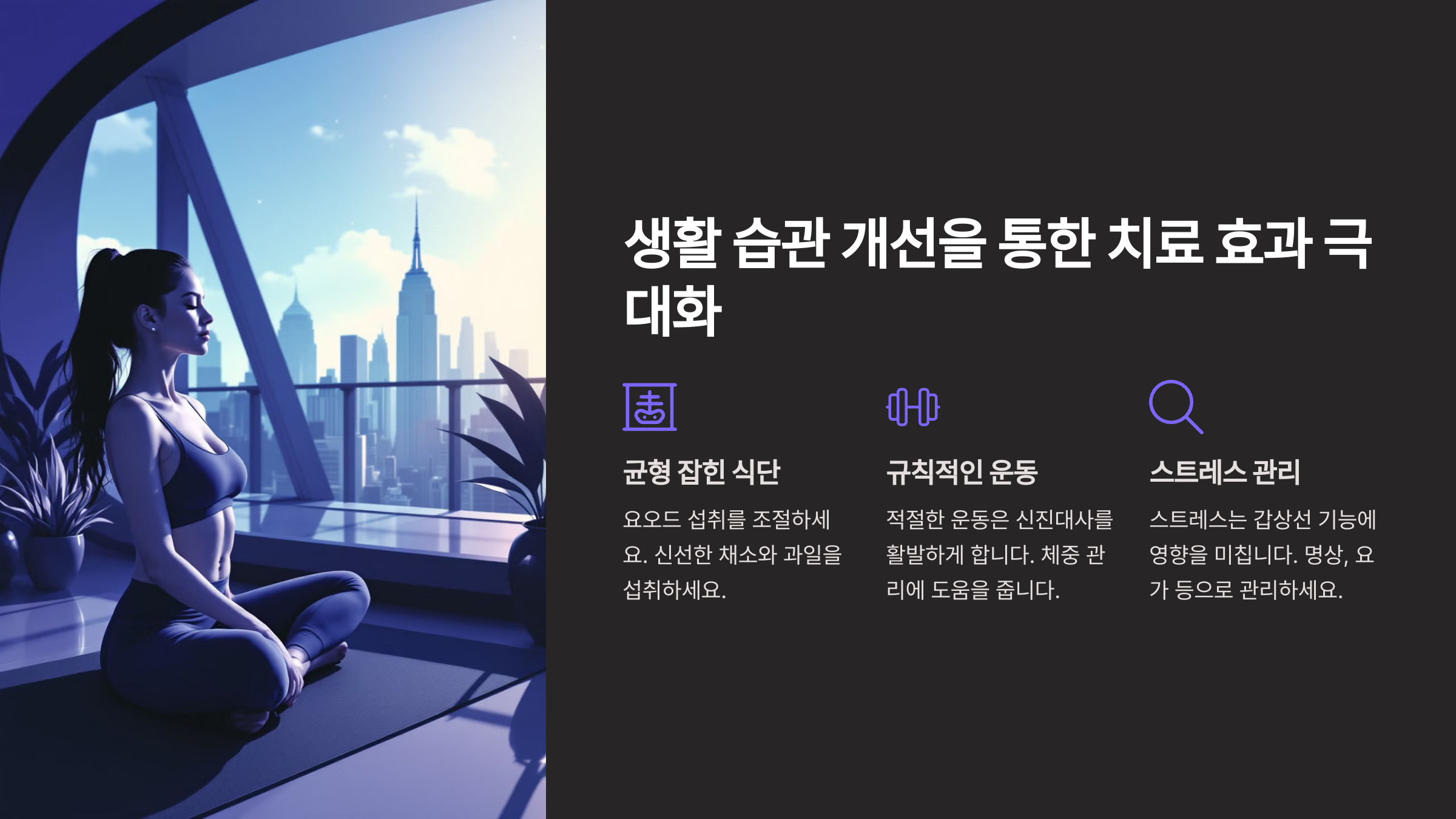 스트레스 관리도 중요해요. 스트레스는 갑상선 호르몬의 균형을 무너뜨릴 수 있으므로, 명상, 요가, 규칙적인 수면 습관을 유지하는 것이 좋아요.