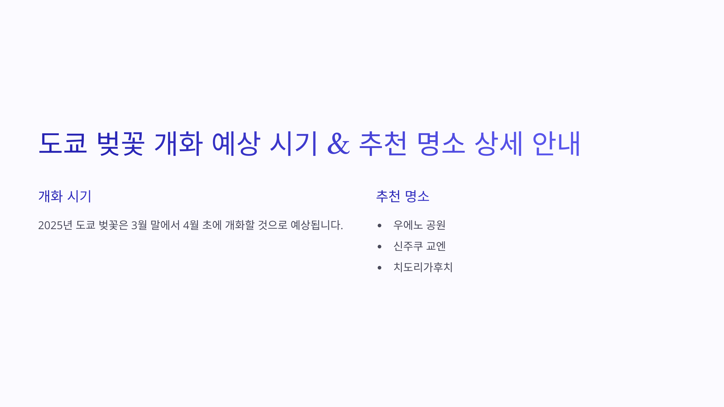 🌸 2025년 도쿄의 벚꽃 개화 예상 시기는 3월 22일경이며, 절정은 3월 28일~4월 3일로 예측되고 있어요. 매년 벚꽃 개화 시기는 조금씩 달라질 수 있지만, 보통 3월 말부터 4월 초까지가 가장 아름다운 시기랍니다.