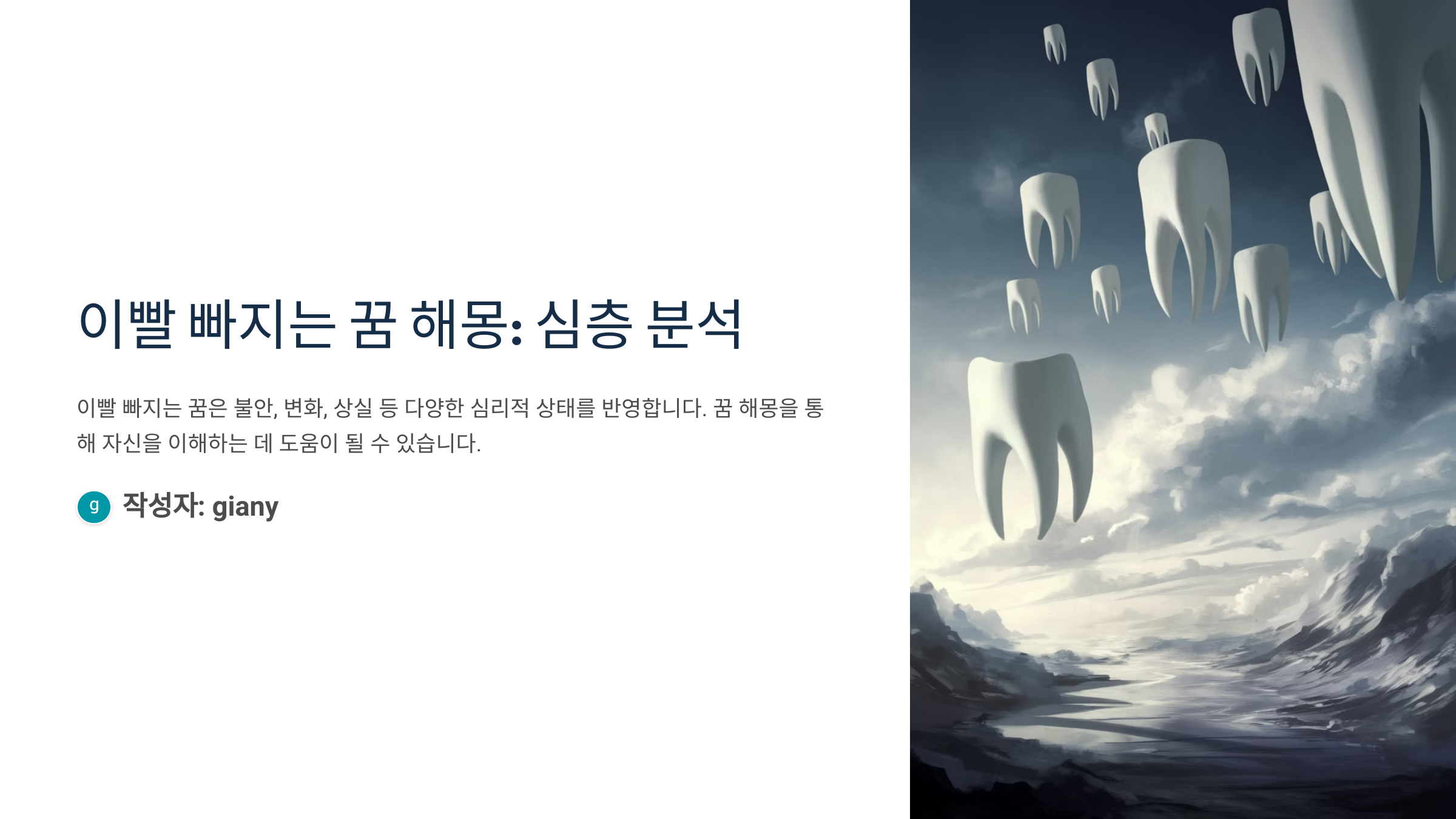 이렇게 이빨 빠지는 꿈은 상황에 따라 해석이 달라져요. 중요한 건 꿈이 전달하는 메시지를 잘 파악하고, 현실에서 대처하는 것이겠죠? 😉