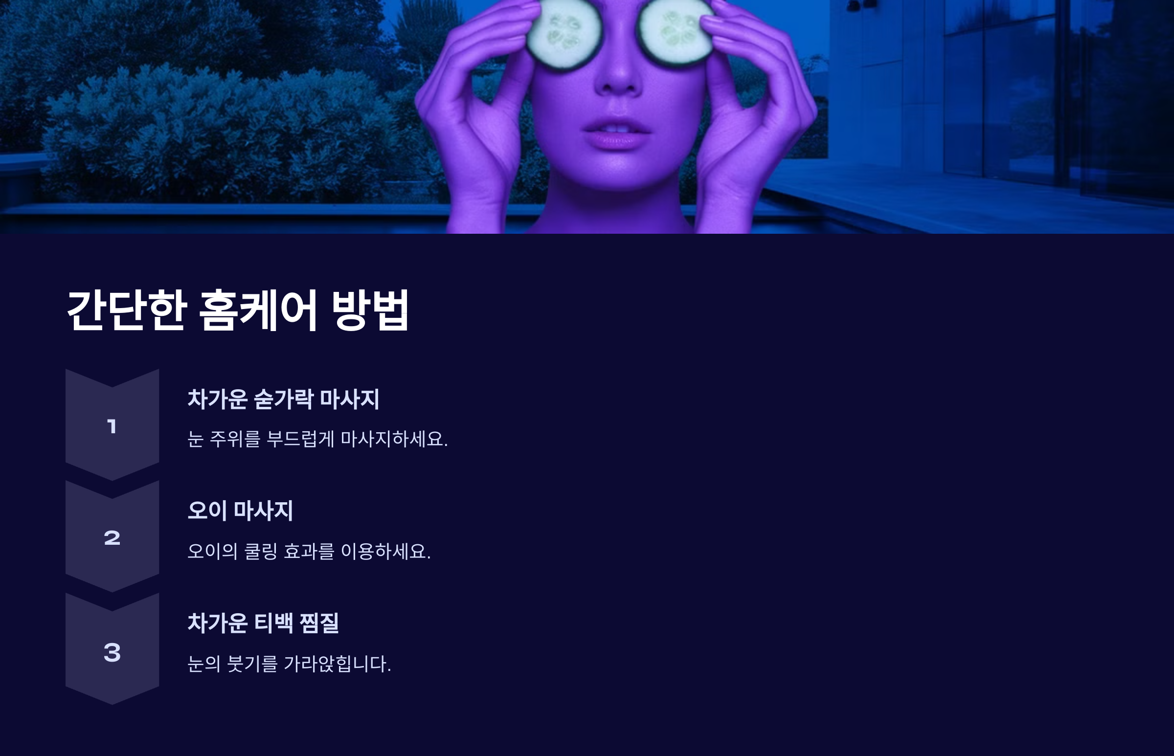 | 냉찜질 | 차가운 티백 또는 얼음팩 사용 | 혈액 순환 촉진, 부기 완화 |