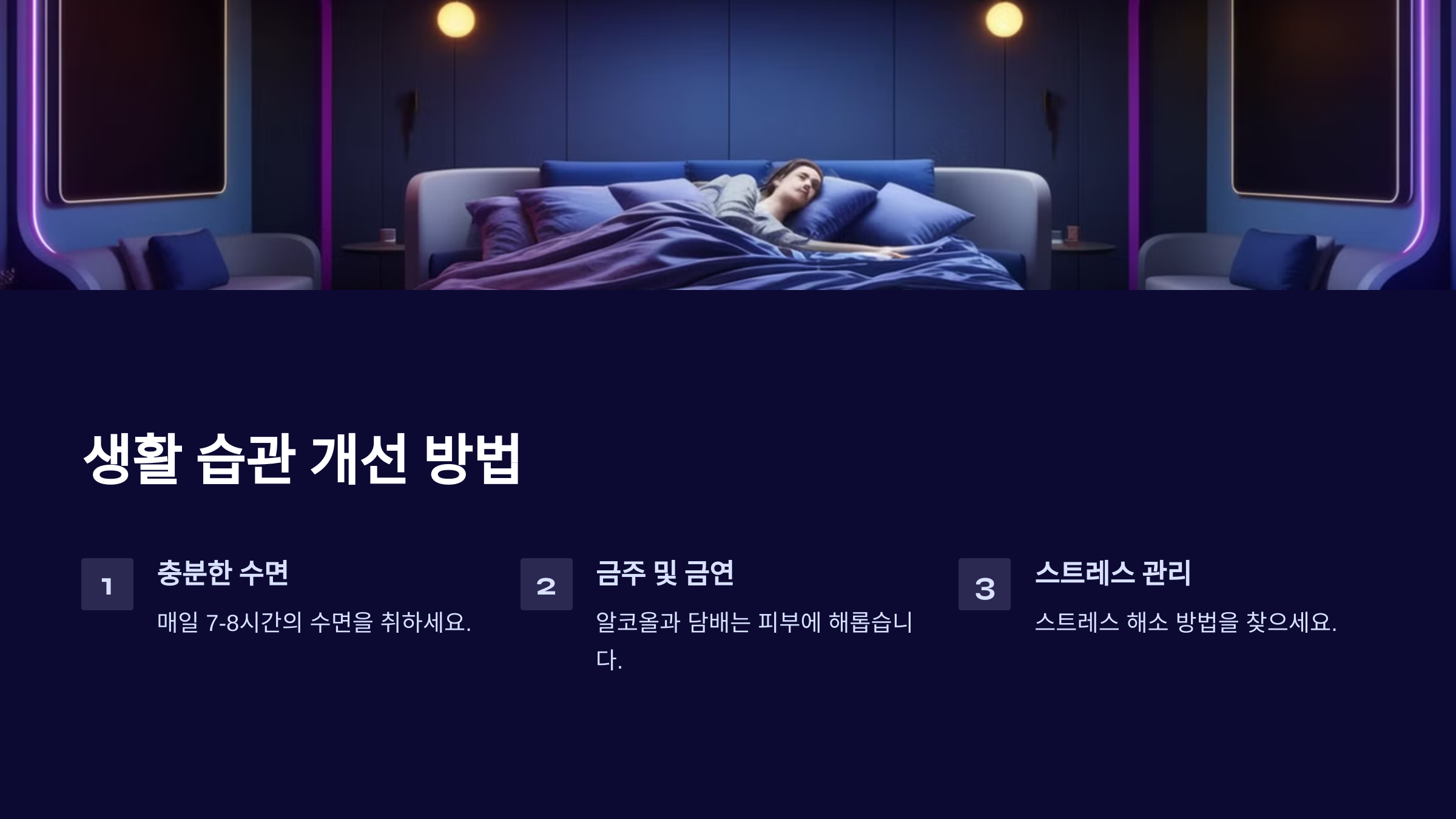다크서클을 줄이려면 생활 습관을 개선하는 것이 중요해요. 특히 수면, 스트레스 관리, 수분 섭취 등을 신경 쓰면 눈 밑 피부가 훨씬 건강해질 수 있어요.