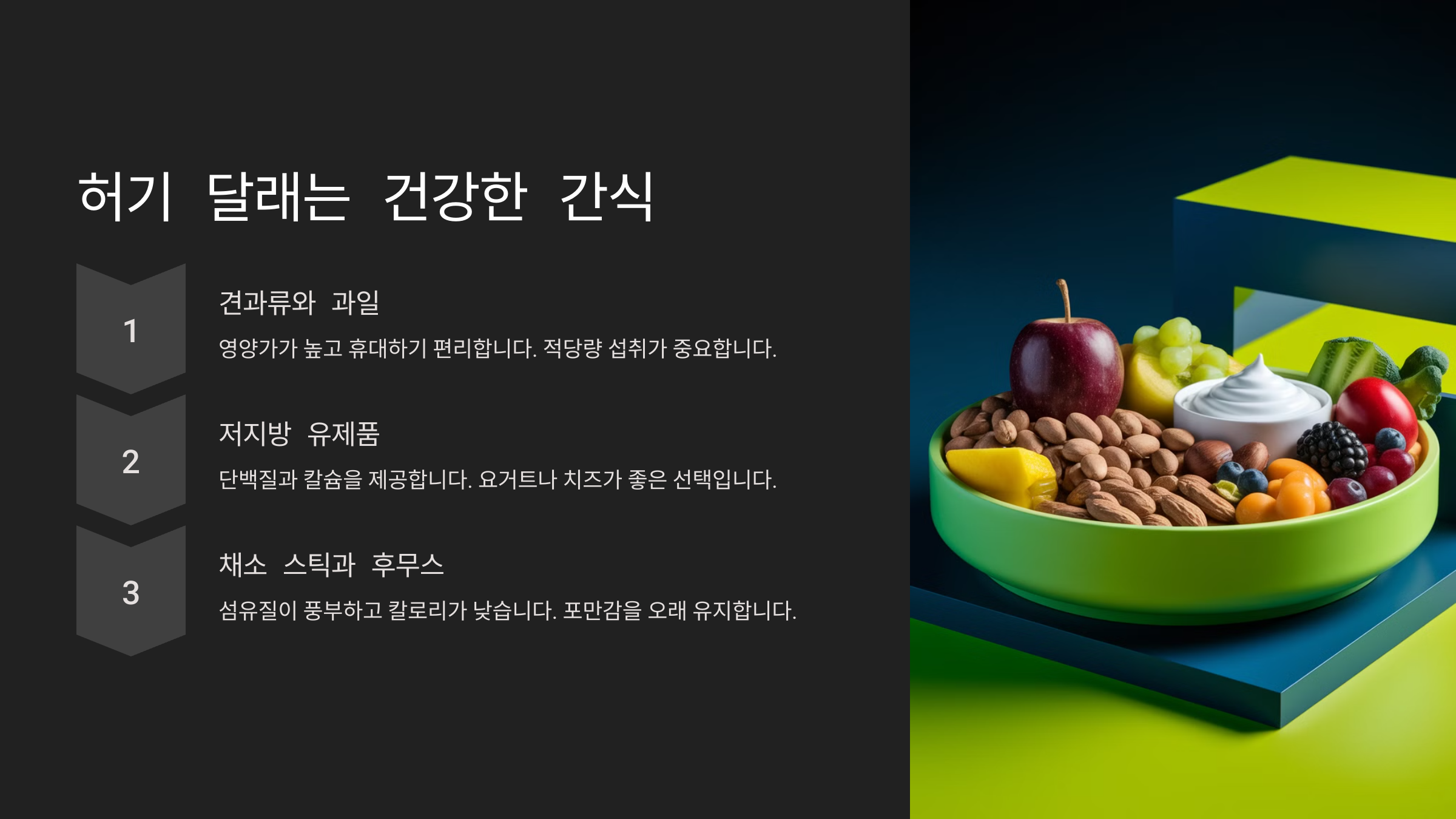 배고픔을 참다 보면 폭식을 하게 될 수도 있어요. 하지만 건강한 간식을 선택하면 불필요한 칼로리 섭취를 줄이면서도 포만감을 유지할 수 있어요.