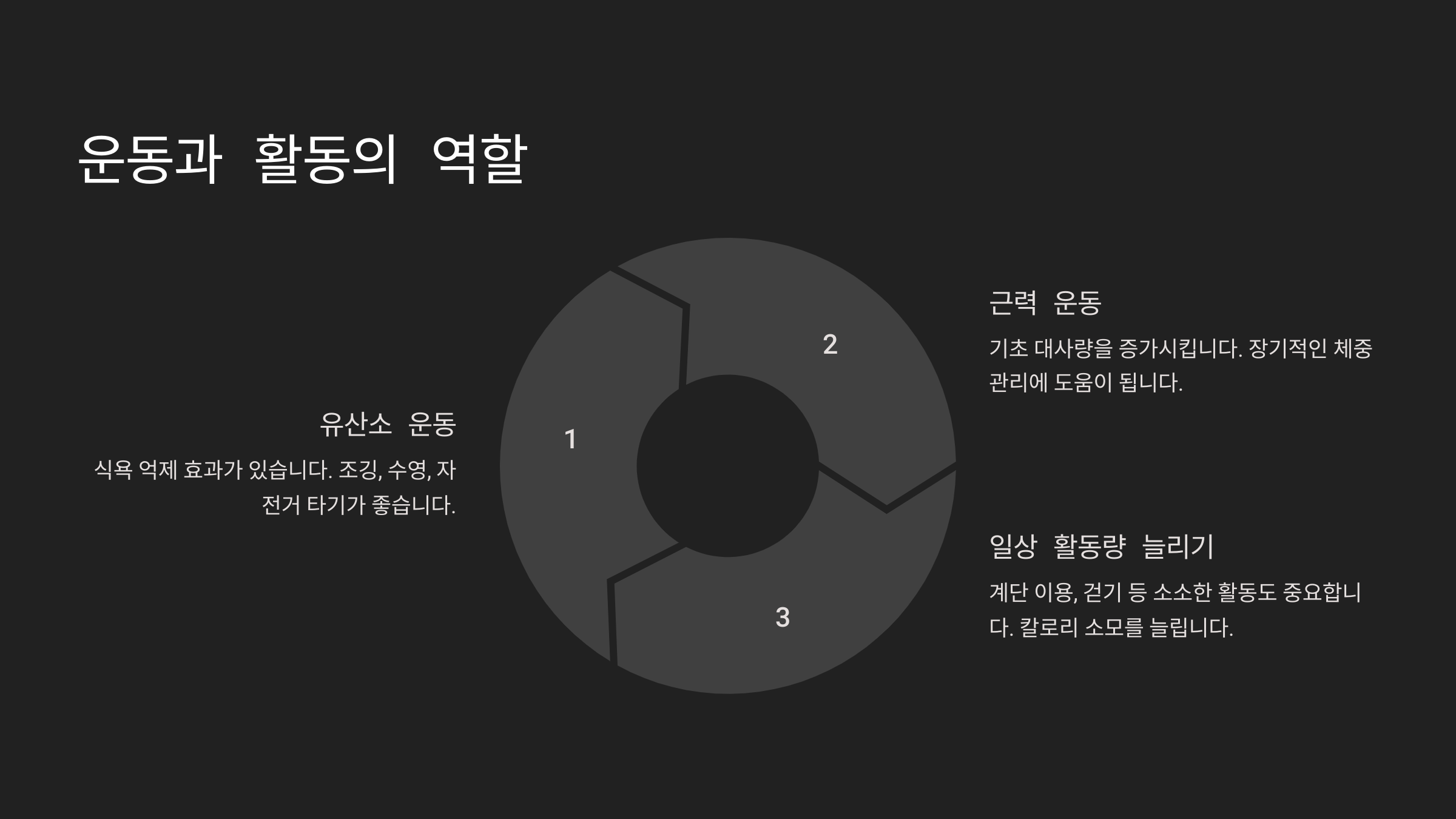 - 규칙적인 운동(가벼운 유산소, 근력 운동)