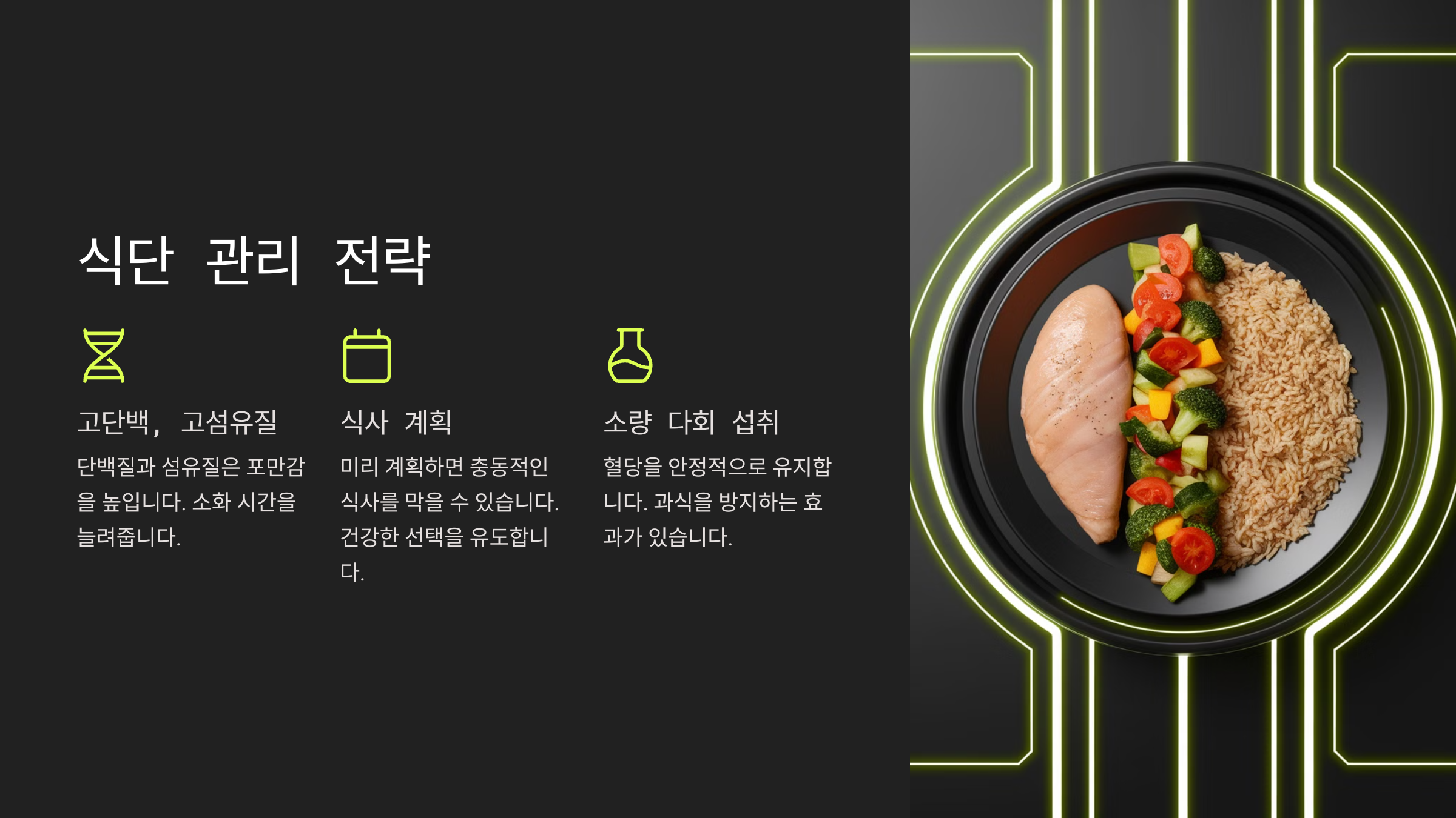 - 단백질: 닭가슴살, 두부, 달걀, 생선, 그릭요거트