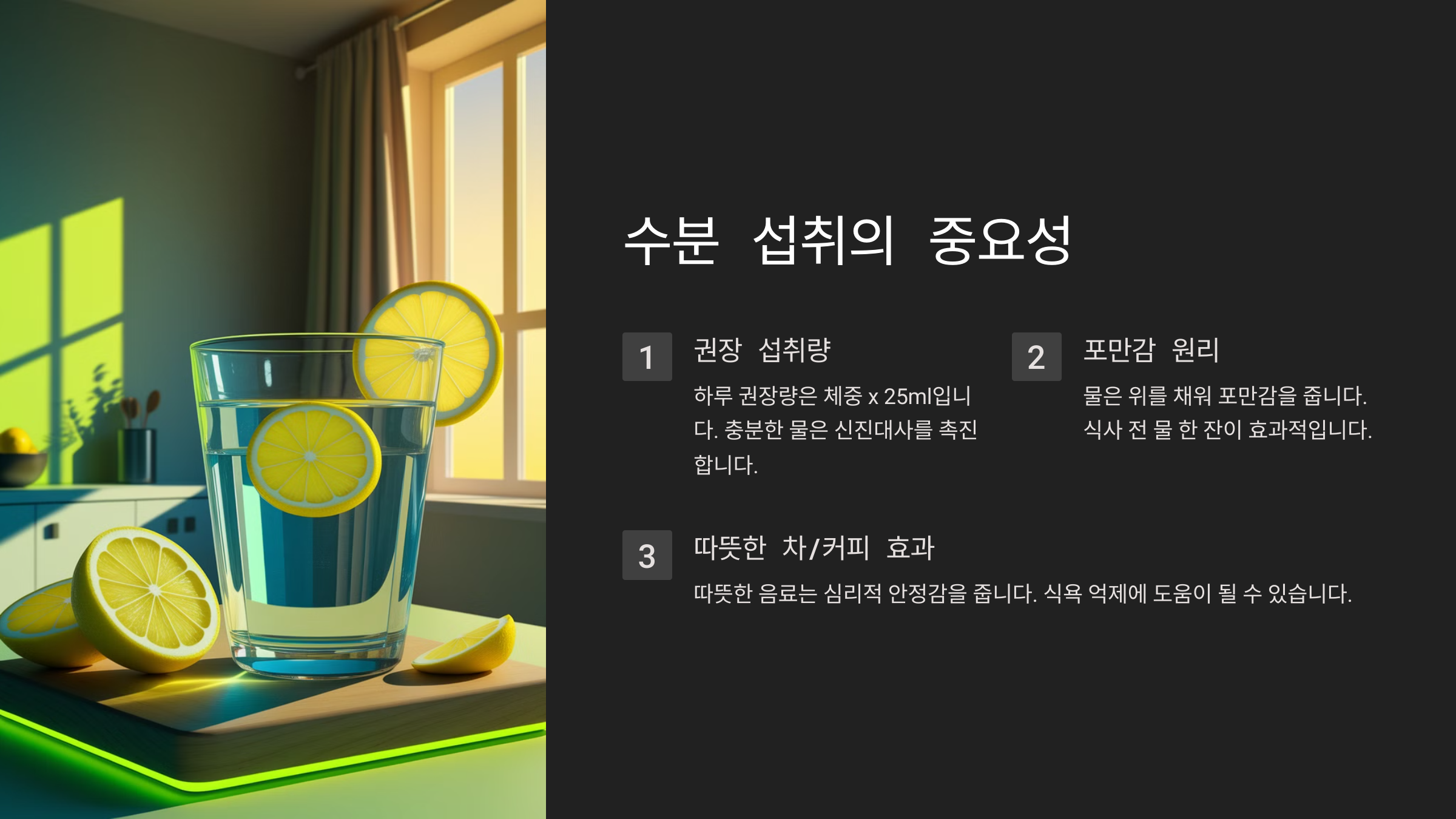 - 하루 최소 2L 이상의 물 섭취