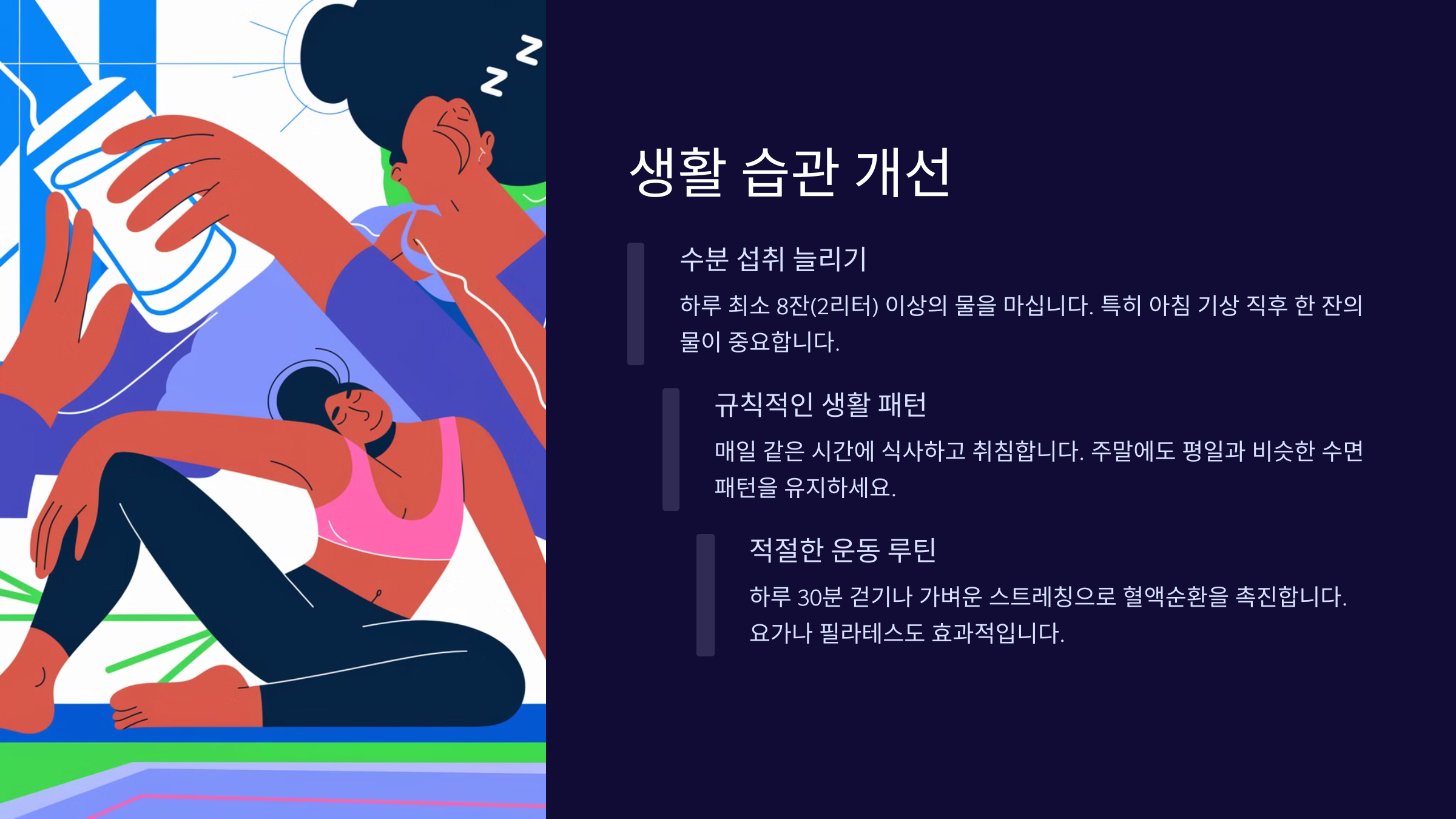 | 규칙적인 수면 | 뇌 피로 감소, 신체 리듬 조절 | 수면 부족성 두통 예방 |