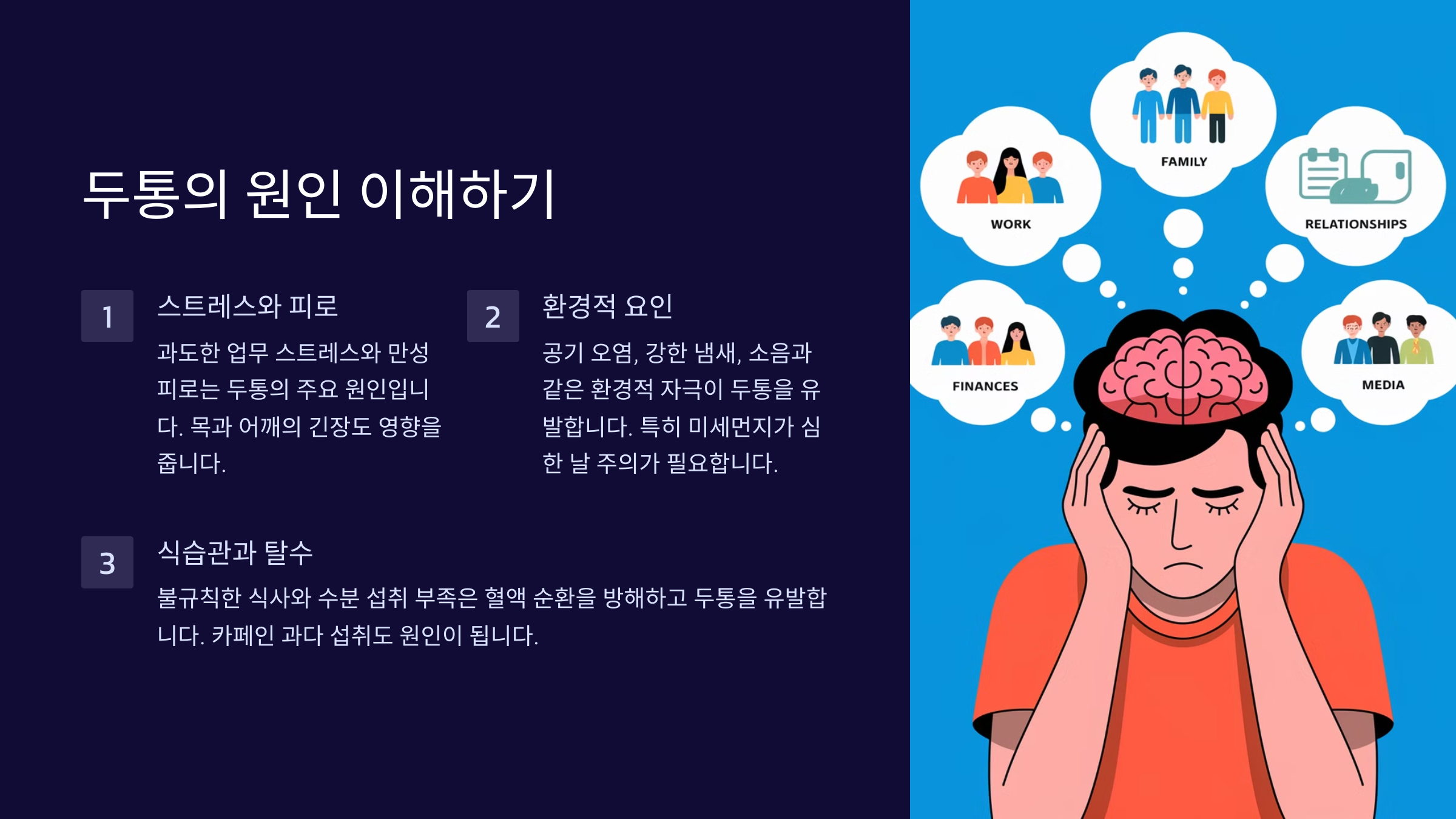 1️⃣ 스트레스: 신경이 예민해지고 근육이 긴장하면서 두통이 발생할 수 있어요.