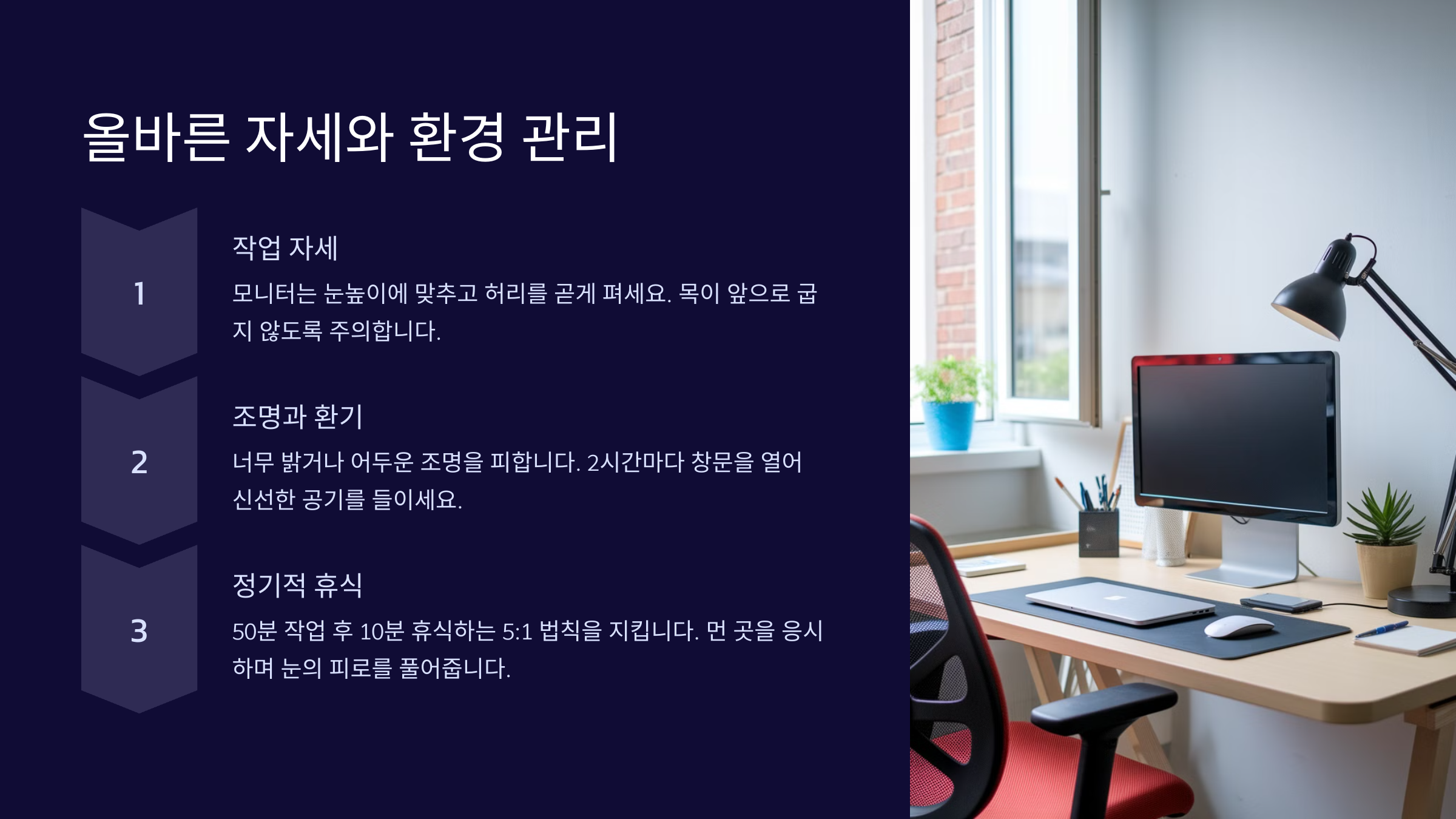 | 스크린 타임 조절 | 눈 피로 감소, 집중력 향상 | 디지털 피로성 두통 예방 |