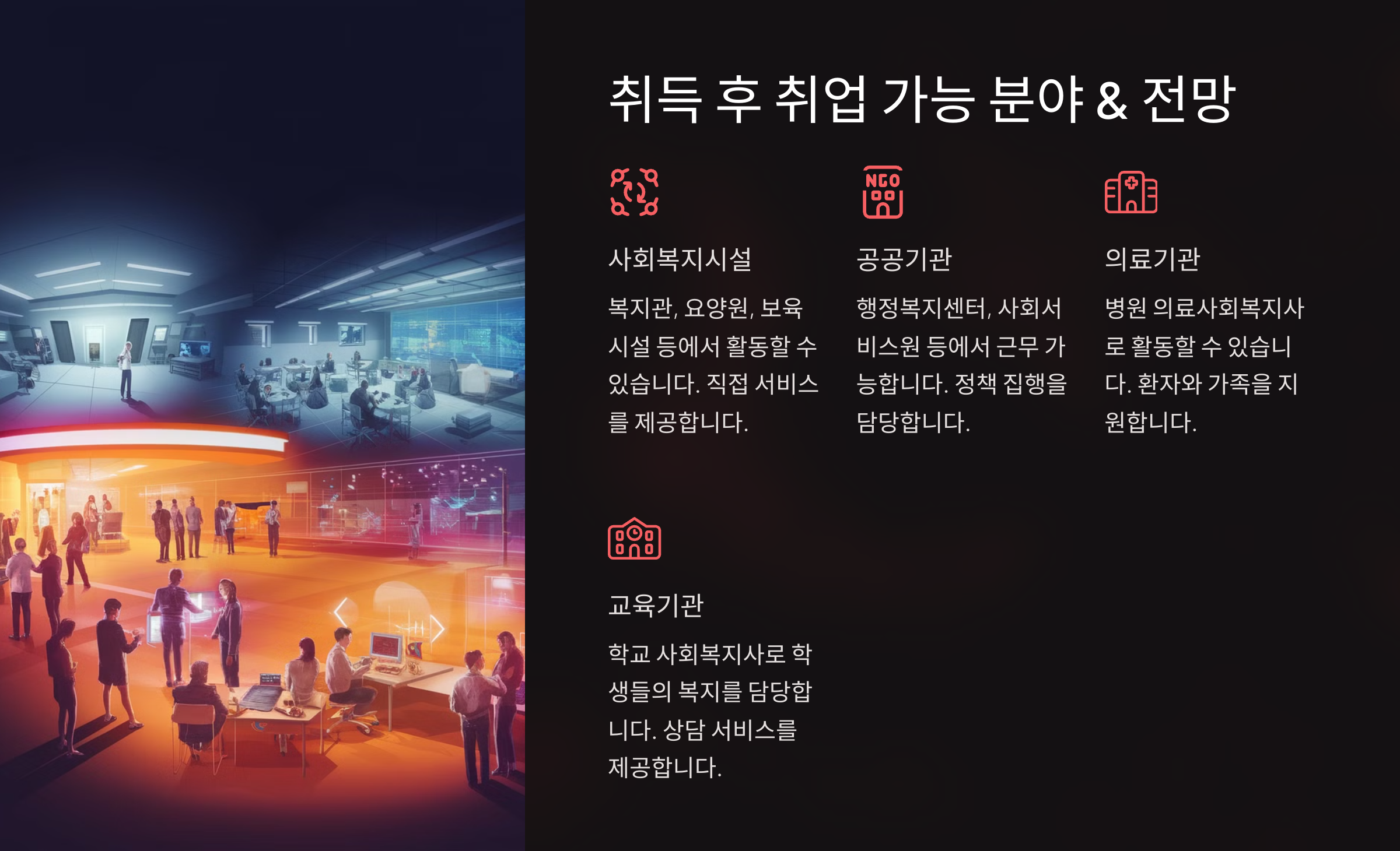 | 공공기관·공무원 | 지자체 복지 공무원, 사회복지 관련 공기업 |