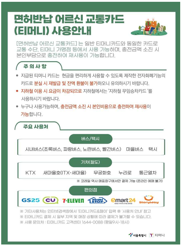 A5. 버스, 택시, 편의점 등 티머니 가맹점에서 사용 가능하지만, 지하철 무임승차 혜택을 받는 경우 별도 무료 교통카드를 사용하는 것이 좋아요.