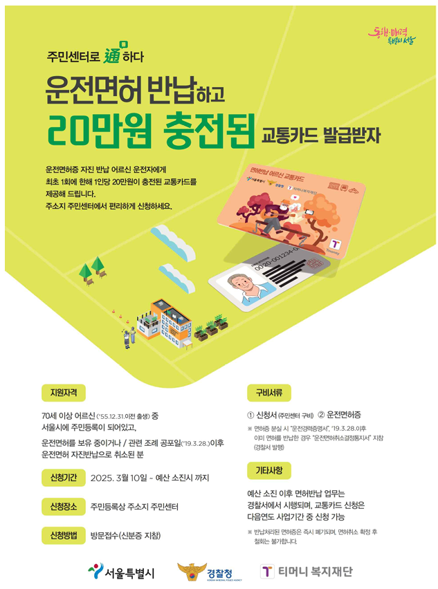 운전면허 반납을 원하시는 70세 이상 어르신들은 거주지 동주민센터를 방문하여 신청할 수 있어요. 면허증을 반납하면 즉시 20만 원이 충전된 선불형 교통카드를 받을 수 있죠.