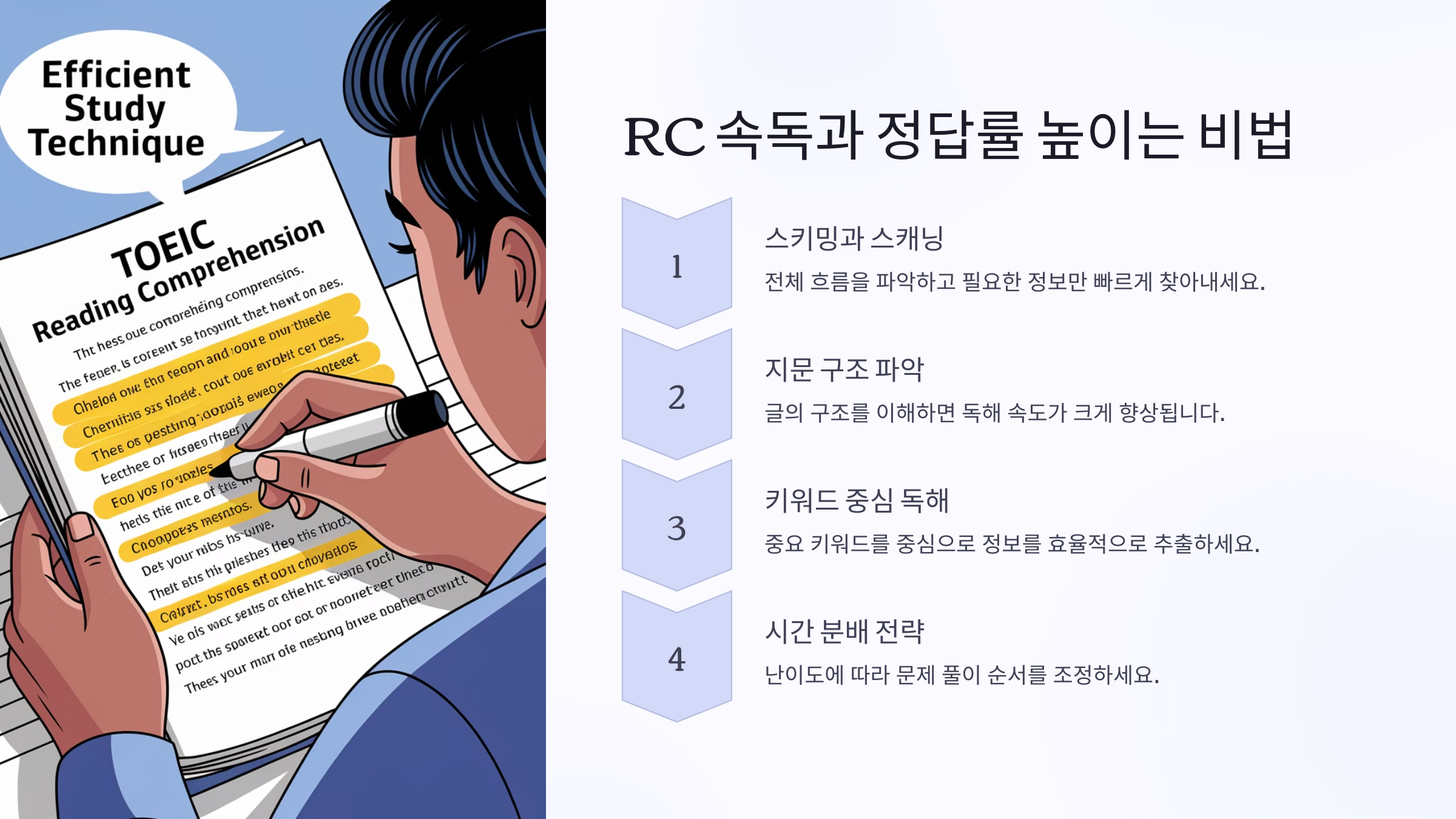LC에서 고득점을 받으려면 단순히 많이 듣는 것이 아니라 정확하게 듣는 연습이 중요해요. 이제 RC(Reading)에서 속독과 정답률을 높이는 비법을 알아볼까요? 📖
