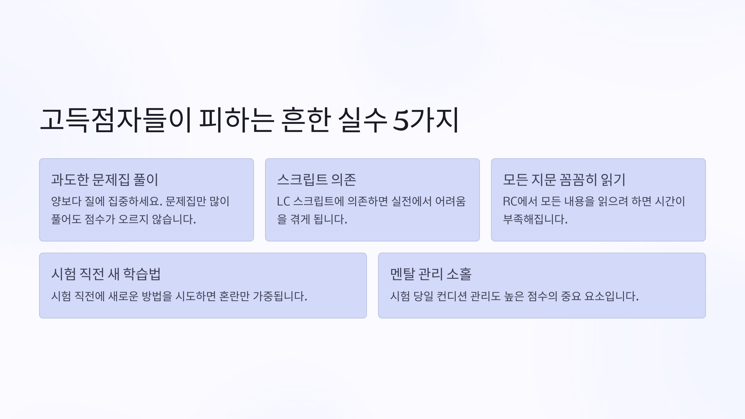 토익 900점을 목표로 공부할 때, 누구나 실수할 수 있어요. 하지만 고득점자들은 특정한 실수를 피하는 법을 알고 있죠. 점수를 갉아먹는 흔한 실수 5가지를 정리했어요! 🚨