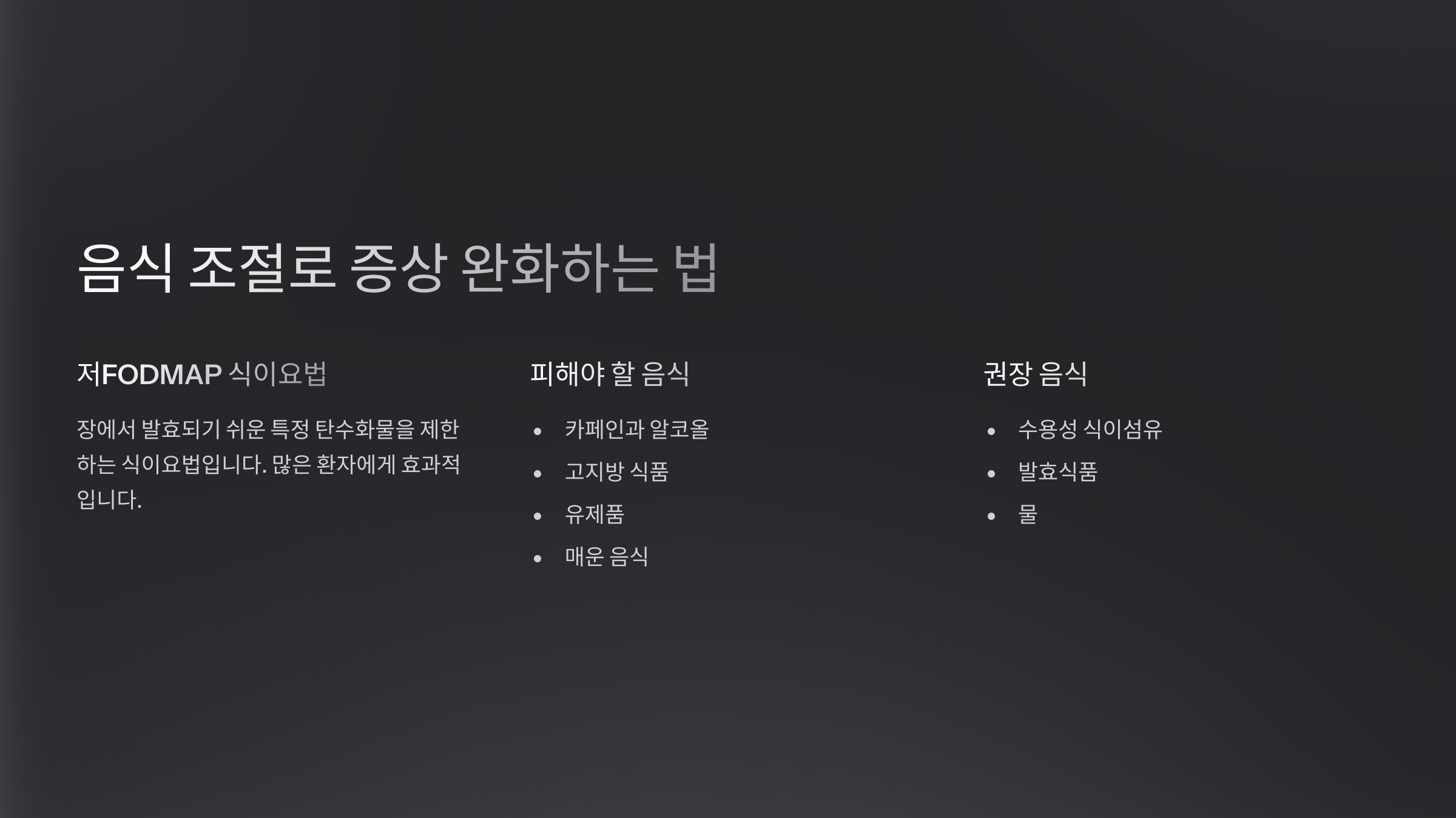 증상을 악화시키는 원인을 피하는 것도 중요하지만, 올바른 식습관을 유지하는 것도 필수예요. 다음 섹션에서 음식 조절로 증상을 완화하는 법을 알아볼게요! 🥗