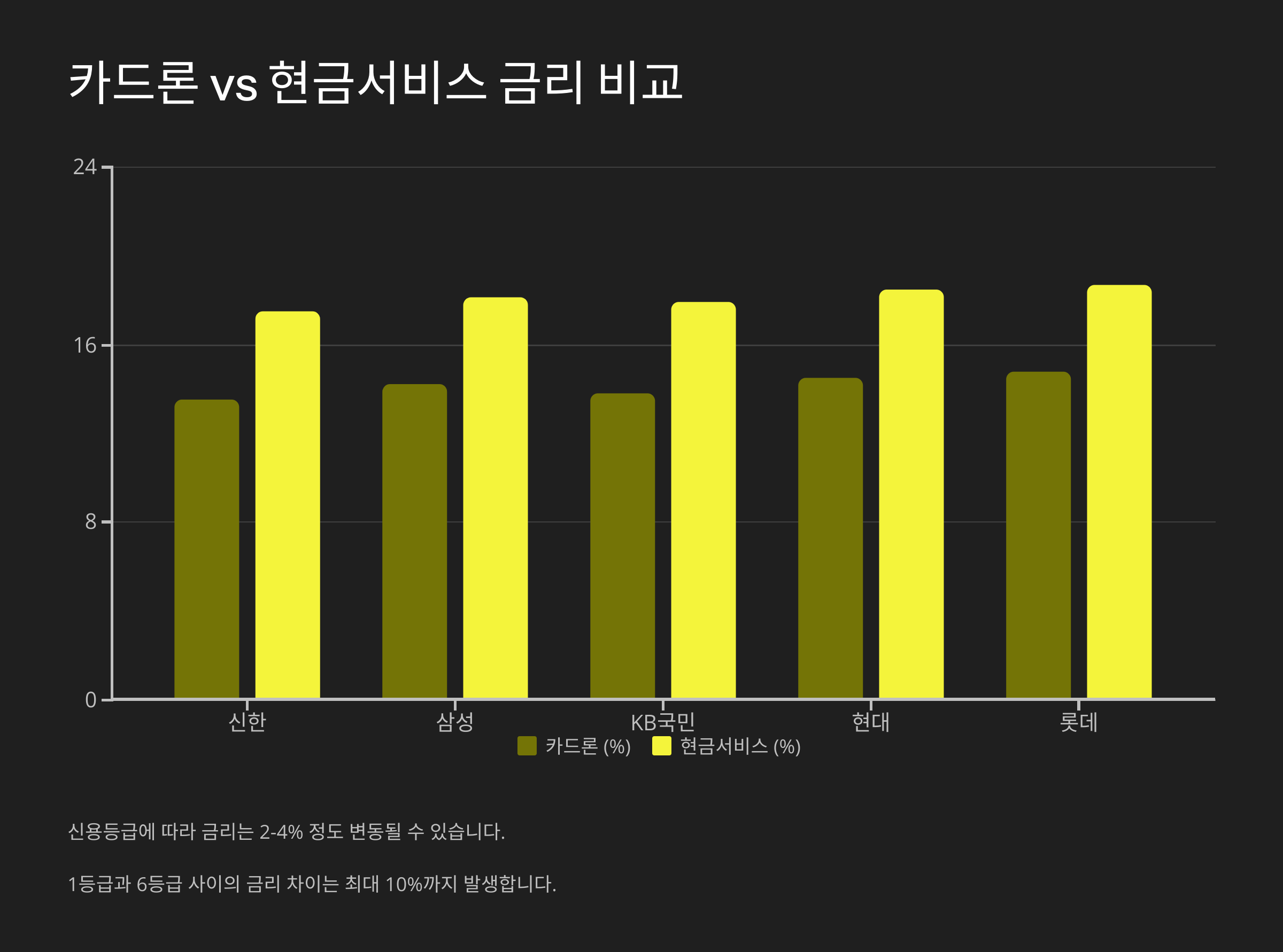 카드사마다 금리는 다를 수 있지만, 일반적으로 카드론의 금리는 4~15%, 현금서비스는 15~20% 수준이에요. 즉, 현금서비스를 이용하면 카드론보다 최대 2배 이상 높은 금리를 부담해야 할 수도 있어요. 📉