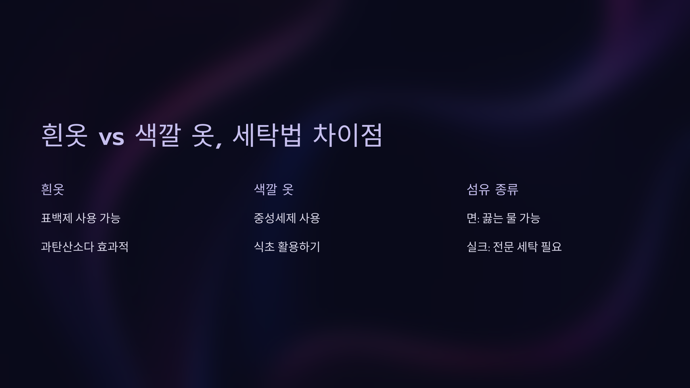 | 흰옷 | 표백제 + 미지근한 물 세탁 | 너무 강한 표백제는 섬유 손상 가능 |