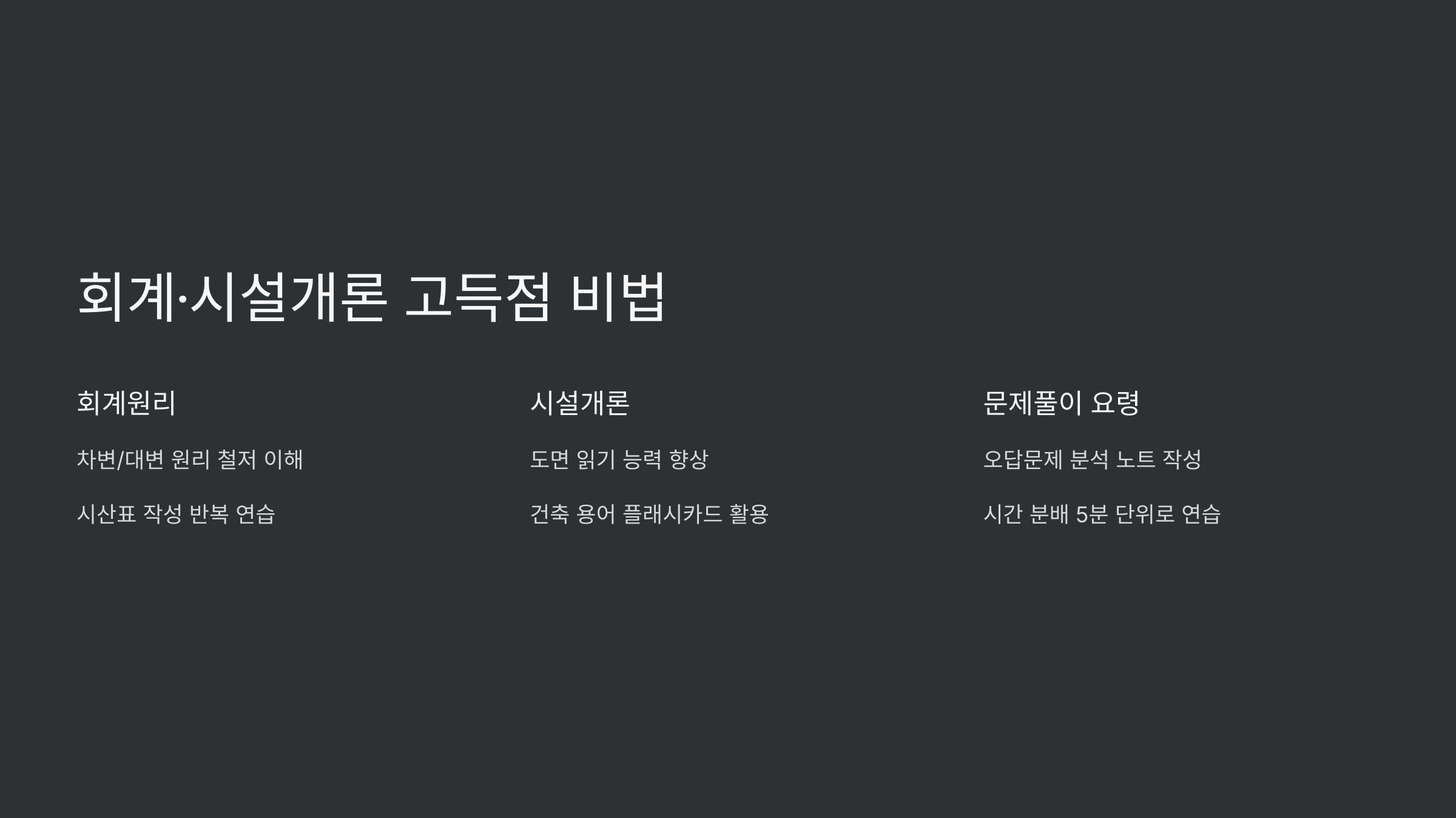 | 회계원리 | 재무제표, 손익계산서, 회계 등식 | 개념 이해 후 실전 문제 풀이 |