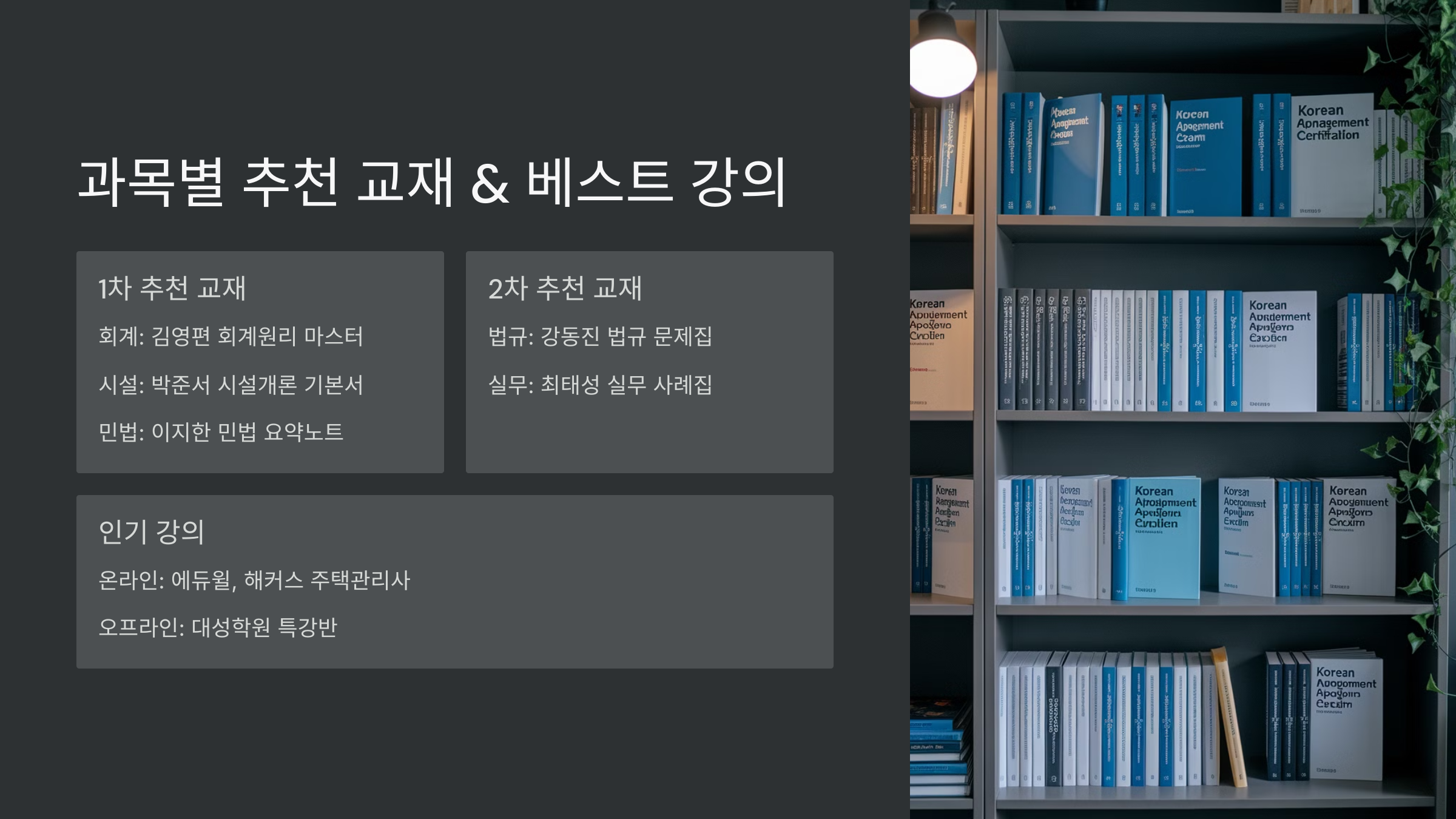 아래는 과목별로 가장 많이 추천되는 교재와 인기 있는 강의 리스트예요. 수험생들의 후기를 참고해서 자신에게 맞는 교재와 강의를 선택하면 좋아요.