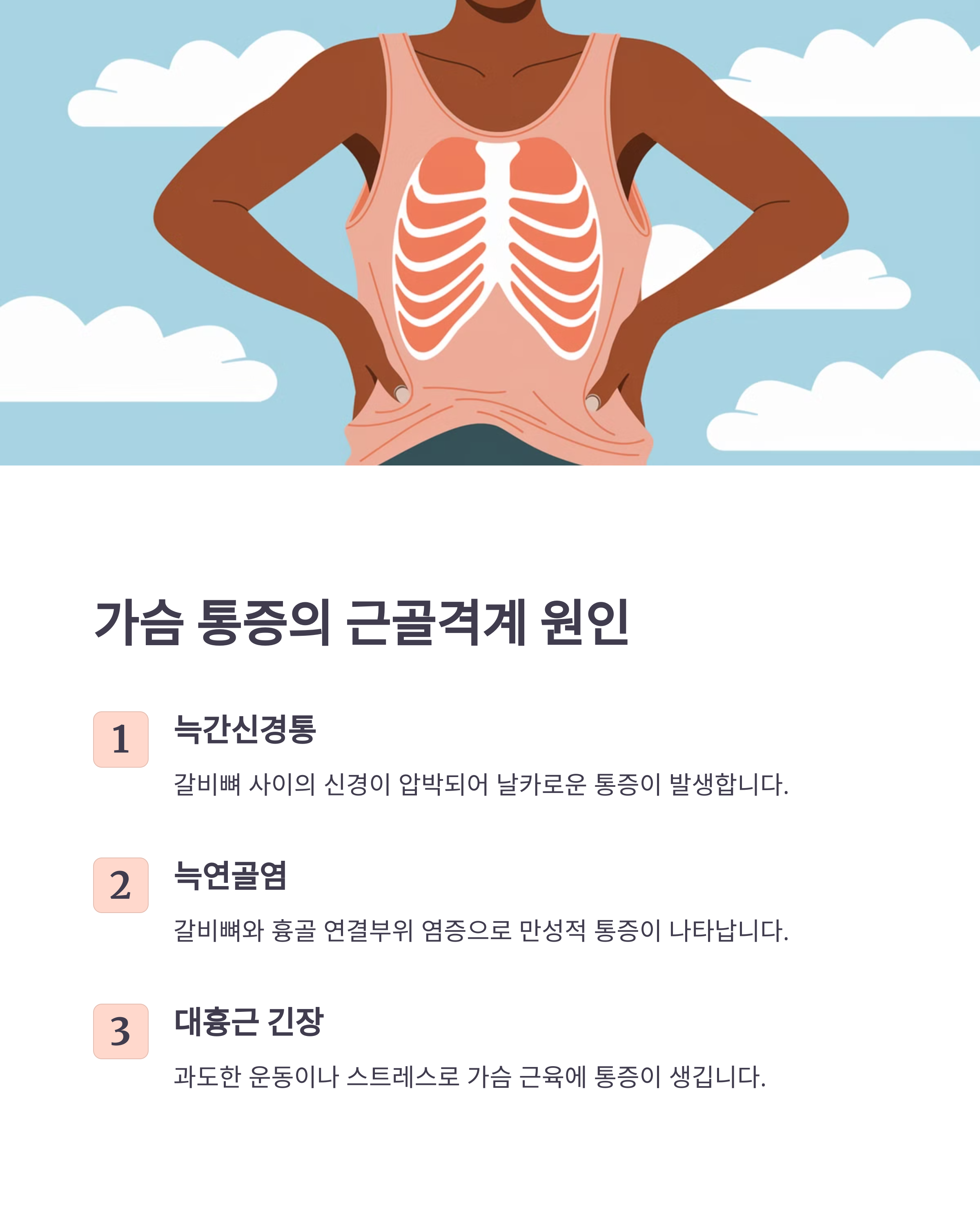 - 늑간신경통: 갈비뼈 사이를 지나는 신경이 자극을 받아 발생하는 날카로운 통증