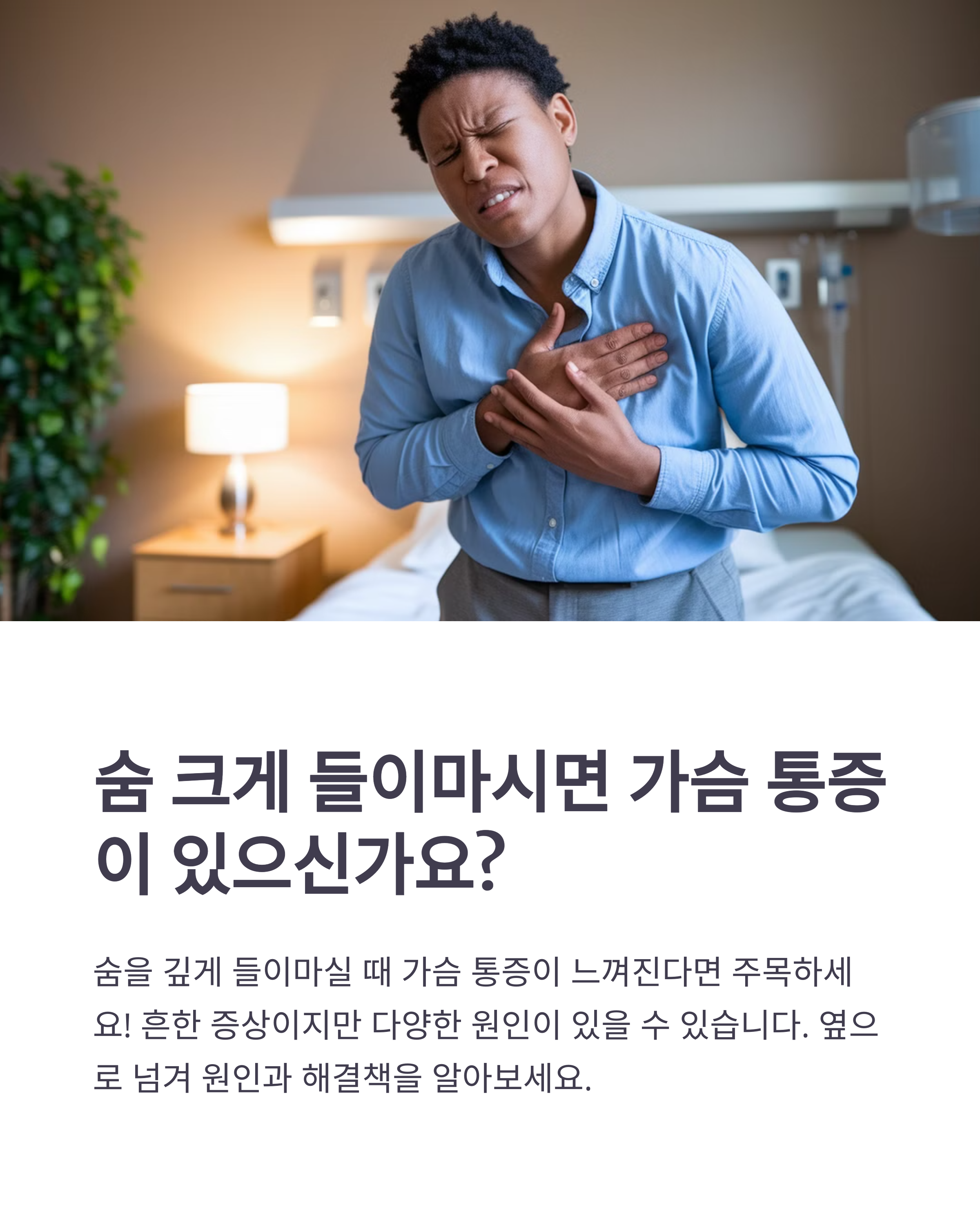숨을 크게 들이마실 때 가슴에 통증이 느껴진다면 단순한 근육통부터 폐 질환이나 심장 문제까지 다양한 원인이 있을 수 있어요. 가벼운 증상이라면 일시적인 불편함일 가능성이 크지만, 지속되거나 악화된다면 반드시 원인을 확인하는 것이 중요해요.