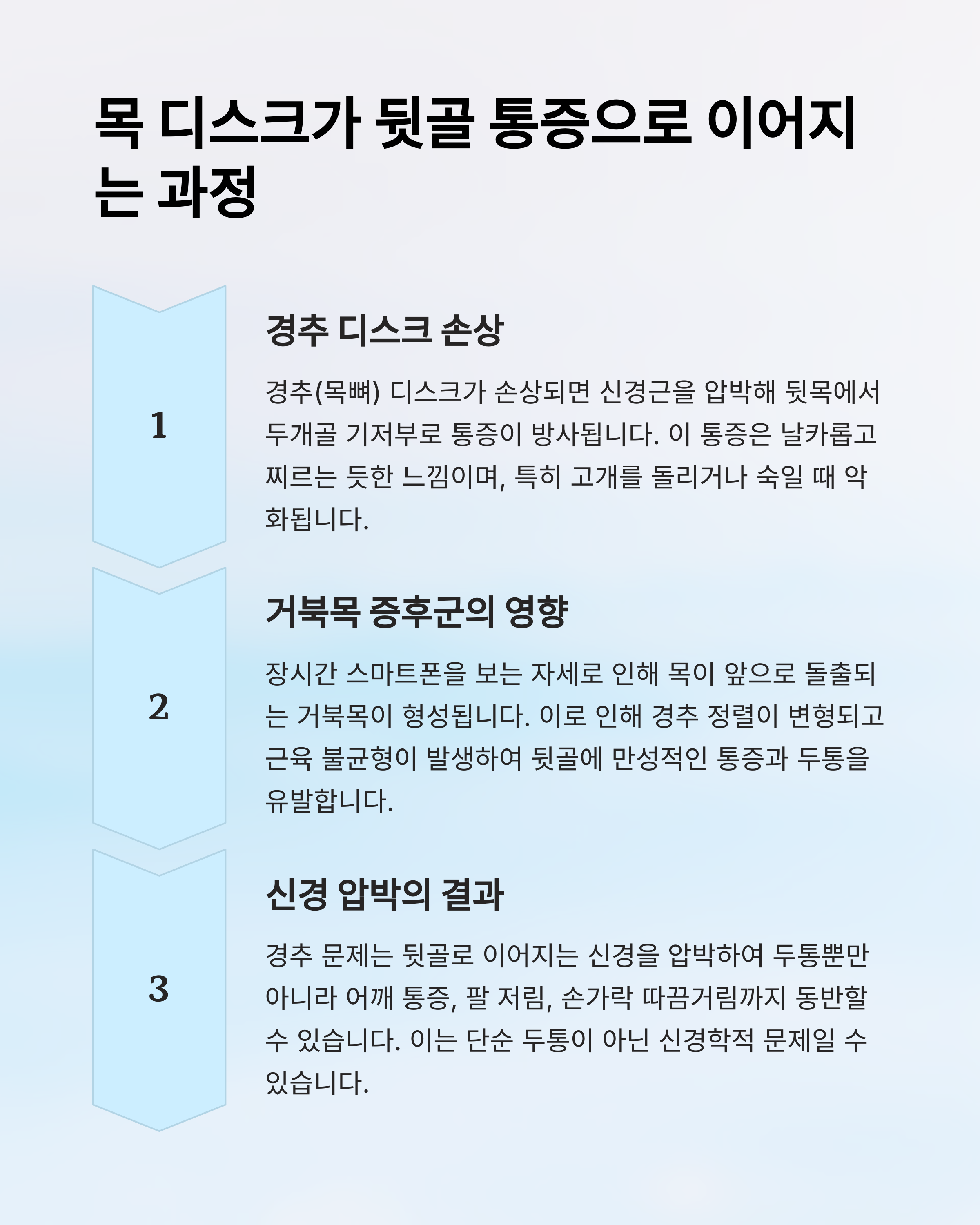| 주요 증상 | 뒷목 통증, 팔 저림, 두통 | 뒷골 당김, 어깨 결림, 머리 무거움 |