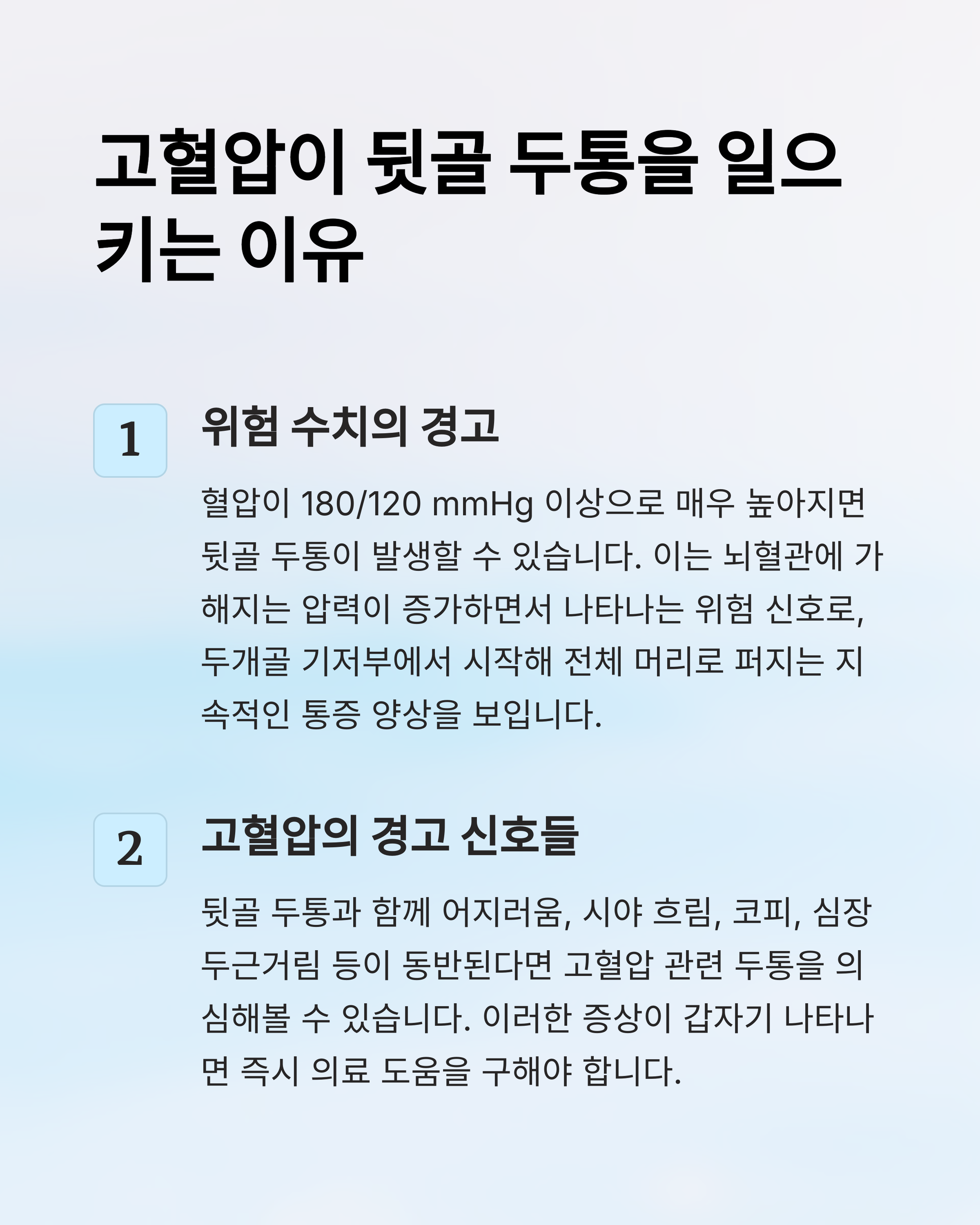 또한, 혈압이 180/120mmHg 이상으로 급격히 상승하면서 두통이 심하다면 즉시 병원을 방문해야 해요. 🚨