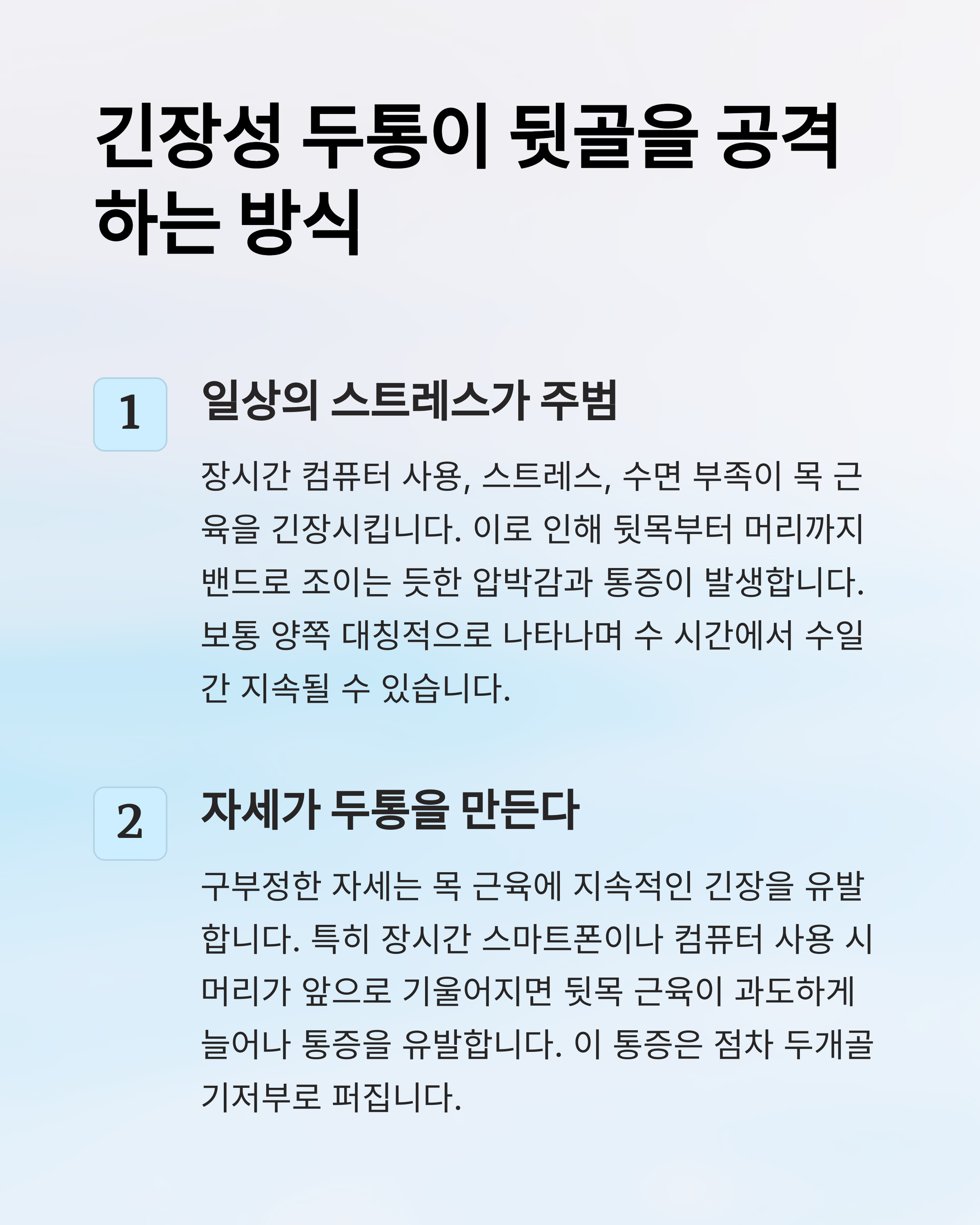 특히 뒷목과 어깨 근육이 뭉쳐서 발생하는 경우가 많아요. 장시간 같은 자세를 유지하거나, 스트레스를 많이 받을 때 이런 두통이 심해질 수 있어요.