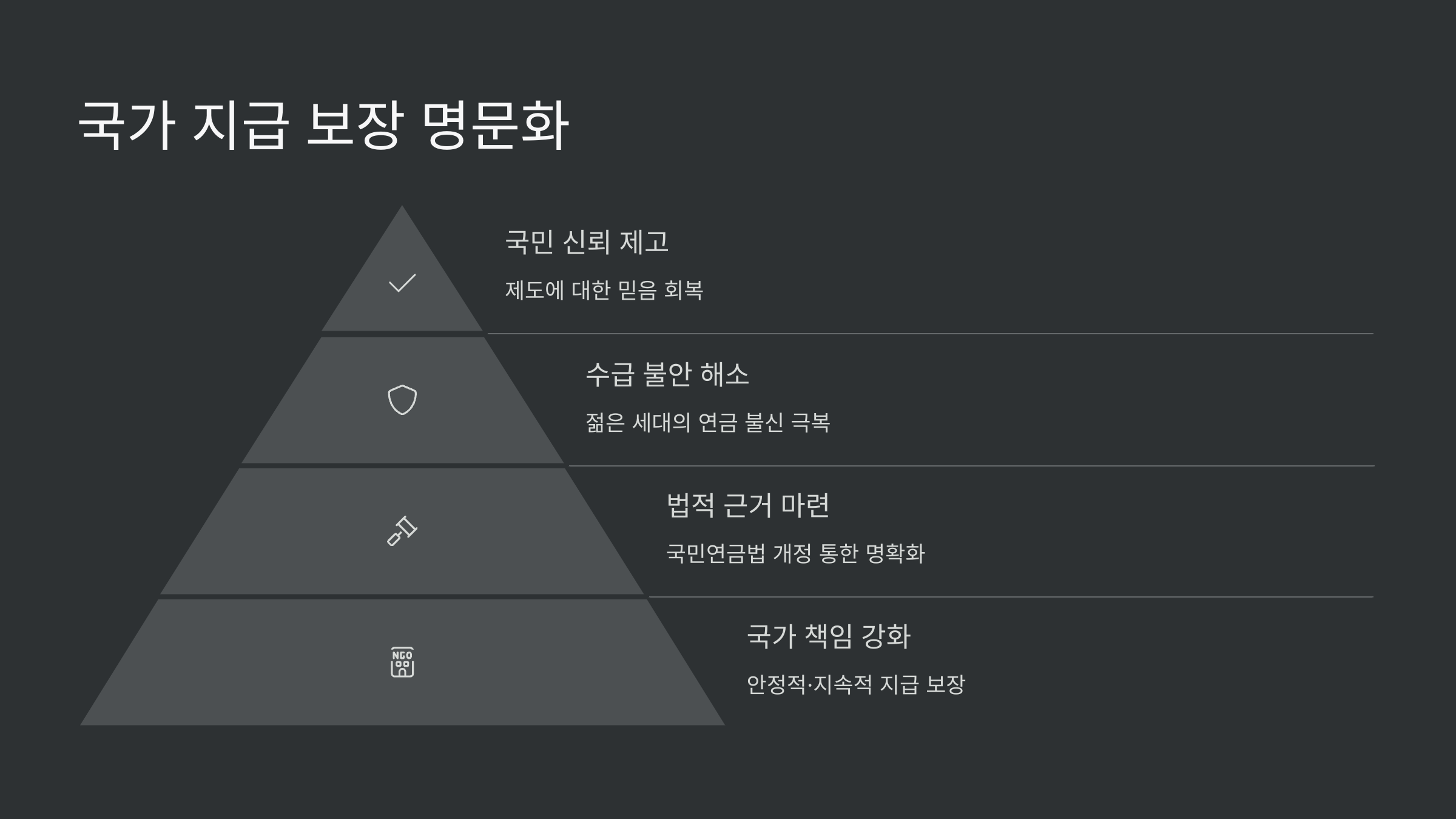 이번 개혁에서 가장 주목할 만한 변화 중 하나는 국민연금 지급을 국가가 책임지고 보장한다는 점을 법에 명시한 것이에요. 이전까지는 국민연금이 정부가 운영하는 제도였지만, 법적으로 연금 지급 보장에 대한 명확한 규정이 없었어요.