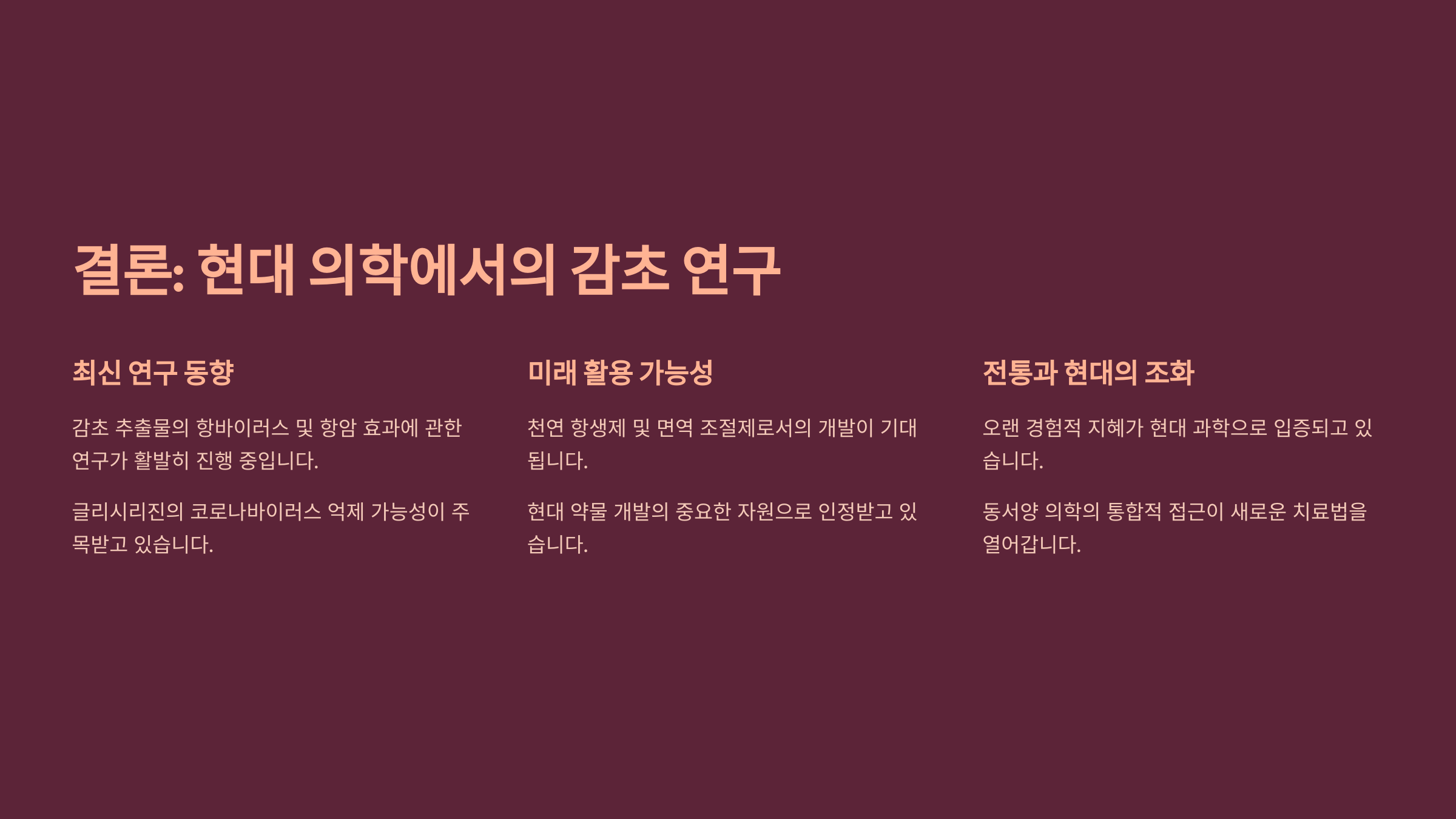 개인적으로 내가 생각했을 때 감초처럼 전통과 현대를 모두 아우르는 약초는 정말 드물다고 느껴져요. 자연 속에서 얻은 지혜가 지금도 유효하다는 게 참 신기하죠. 감초는 시간과 공간을 초월해 여전히 우리 건강을 책임지고 있는 고마운 존재랍니다.
