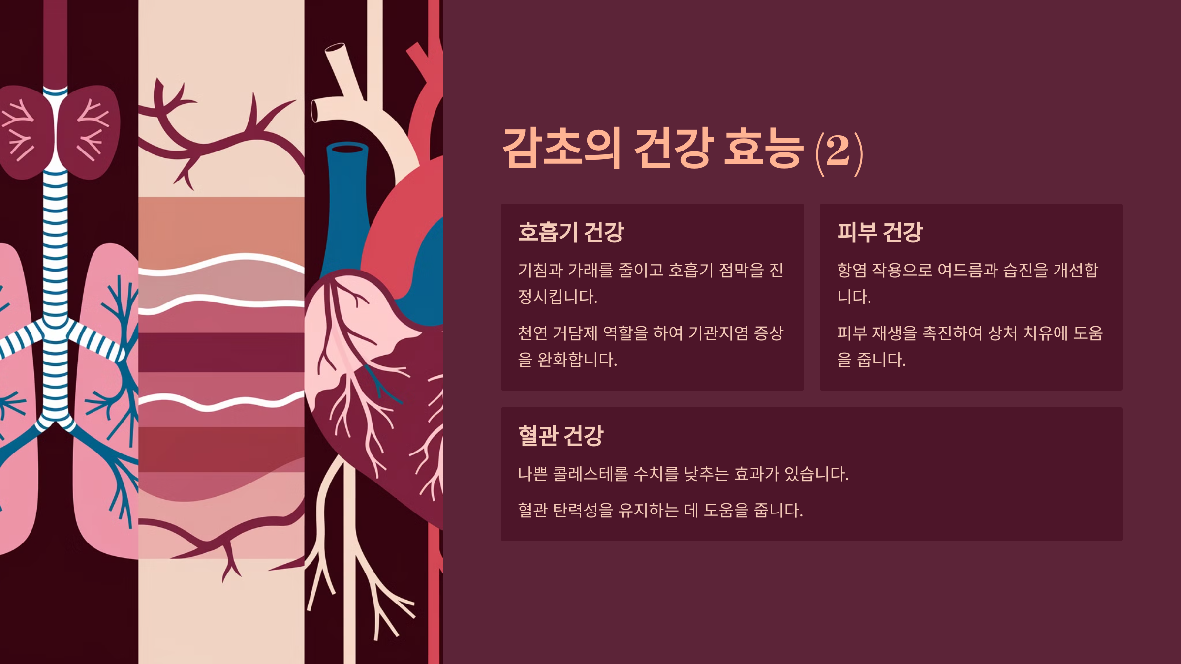 마지막으로 감초는 부종, 관절염, 생리불순 등 염증성 질환이나 호르몬 불균형이 있는 사람들에게도 도움이 될 수 있어요. 정리하자면, 감초는 호흡기, 소화기, 간, 피부, 여성 질환 등 전반적인 신체 건강에 두루 작용하는 다기능 약재예요.