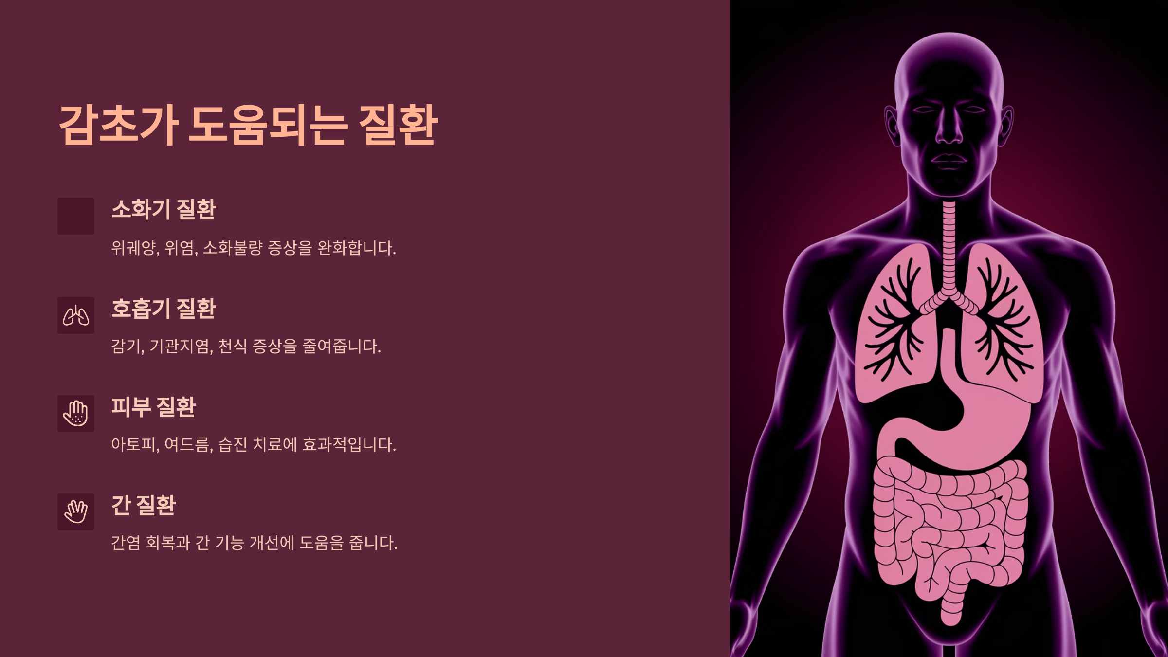 마지막으로 감초는 부종, 관절염, 생리불순 등 염증성 질환이나 호르몬 불균형이 있는 사람들에게도 도움이 될 수 있어요. 정리하자면, 감초는 호흡기, 소화기, 간, 피부, 여성 질환 등 전반적인 신체 건강에 두루 작용하는 다기능 약재예요.