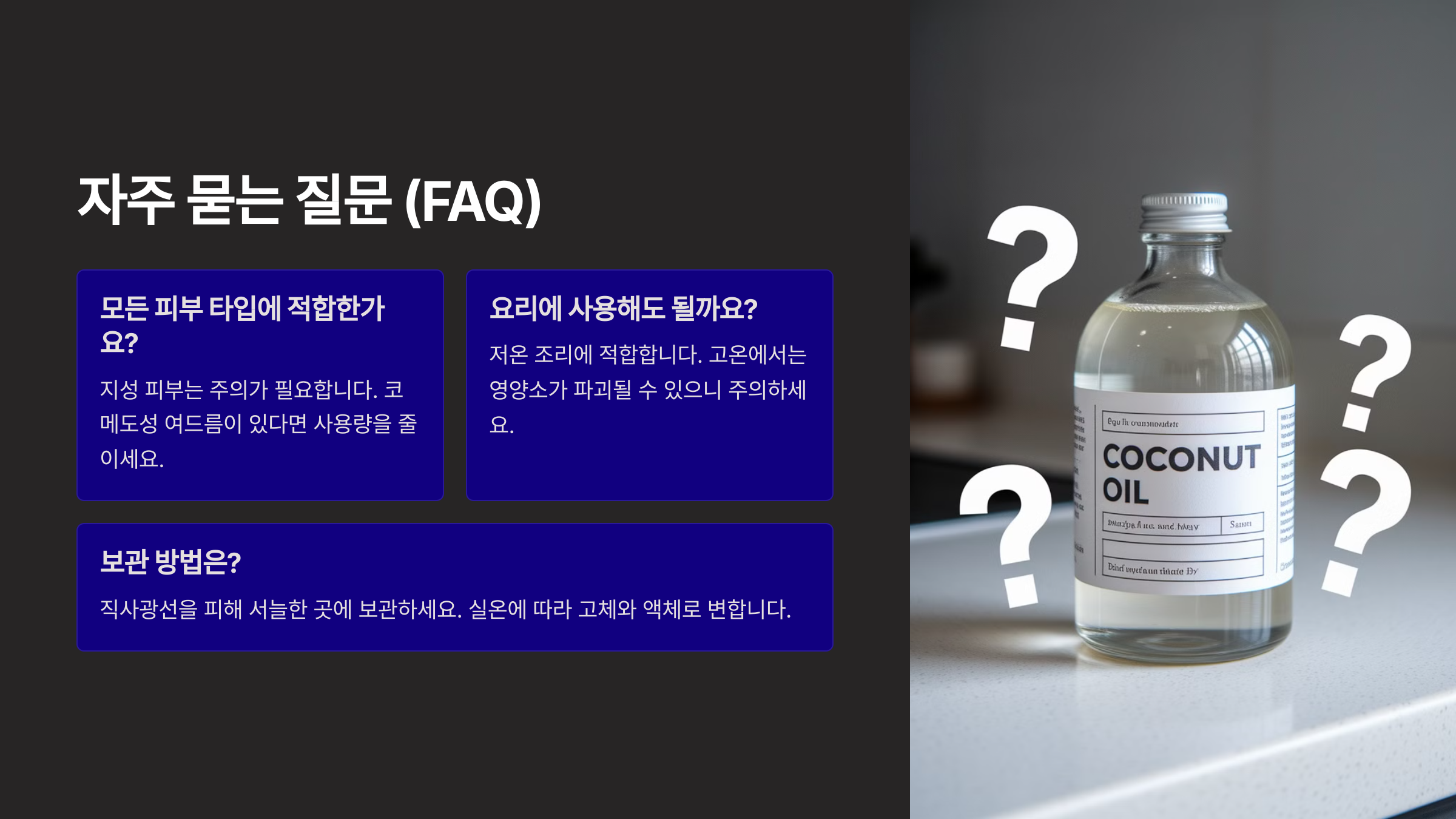 이렇게 다양한 활용이 가능하면서도 순한 코코넛오일은 피부관리 초보자에게도 딱이에요. 마지막으로 궁금증 많은 분들을 위해 실사용자들이 자주 물어보는 질문과 답변을 FAQ 형식으로 정리해봤어요! 😊