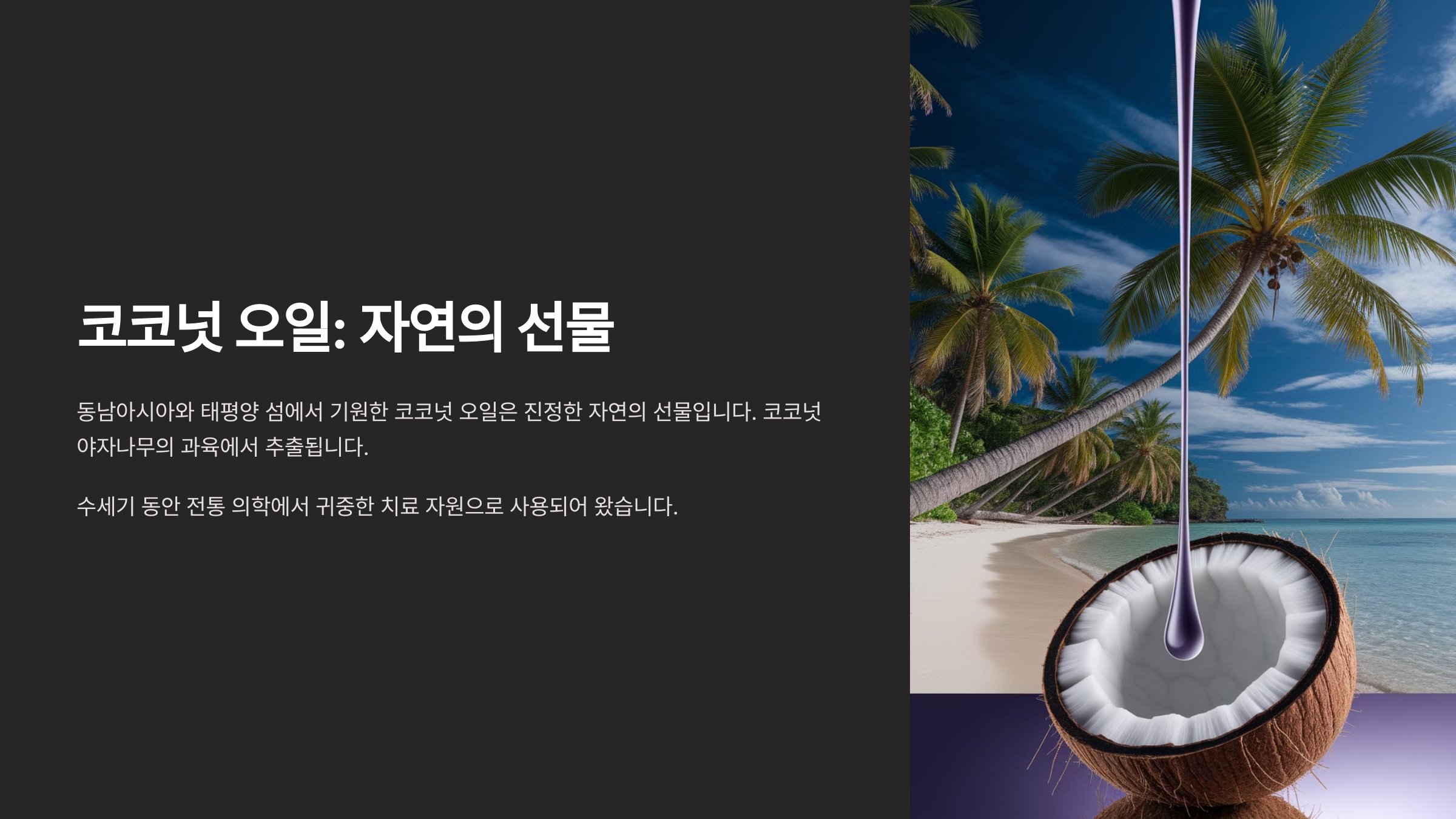 코코넛오일은 열대 지방에서 자라는 코코넛 열매에서 추출한 천연 식물성 오일이에요. 주로 인도, 필리핀, 스리랑카, 태국 등지에서 수백 년 전부터 미용과 건강을 위해 사용돼 왔답니다. 특히 아유르베다에서는 신체 균형을 맞추고 피부를 부드럽게 가꾸는 용도로 코코넛오일을 애용했어요.