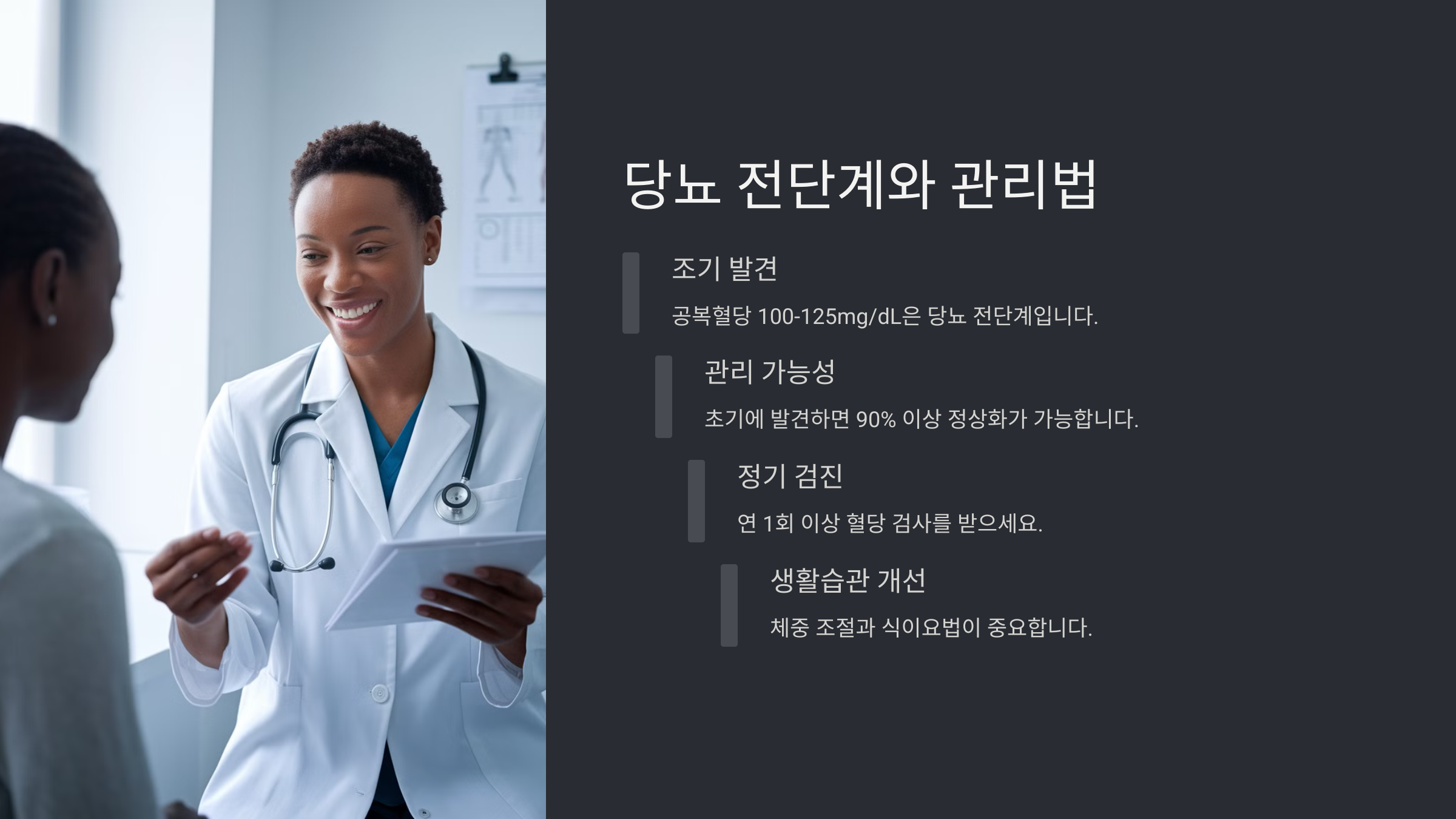 전문가들은 당뇨 전단계에서 3개월 동안 집중적으로 식습관을 조절하고, 하루 30분 이상 걷기 운동만 해도 혈당 수치가 확실히 떨어진다고 말해요. 조기 개입만으로도 당뇨 예방이 가능하다는 점을 꼭 기억하세요!