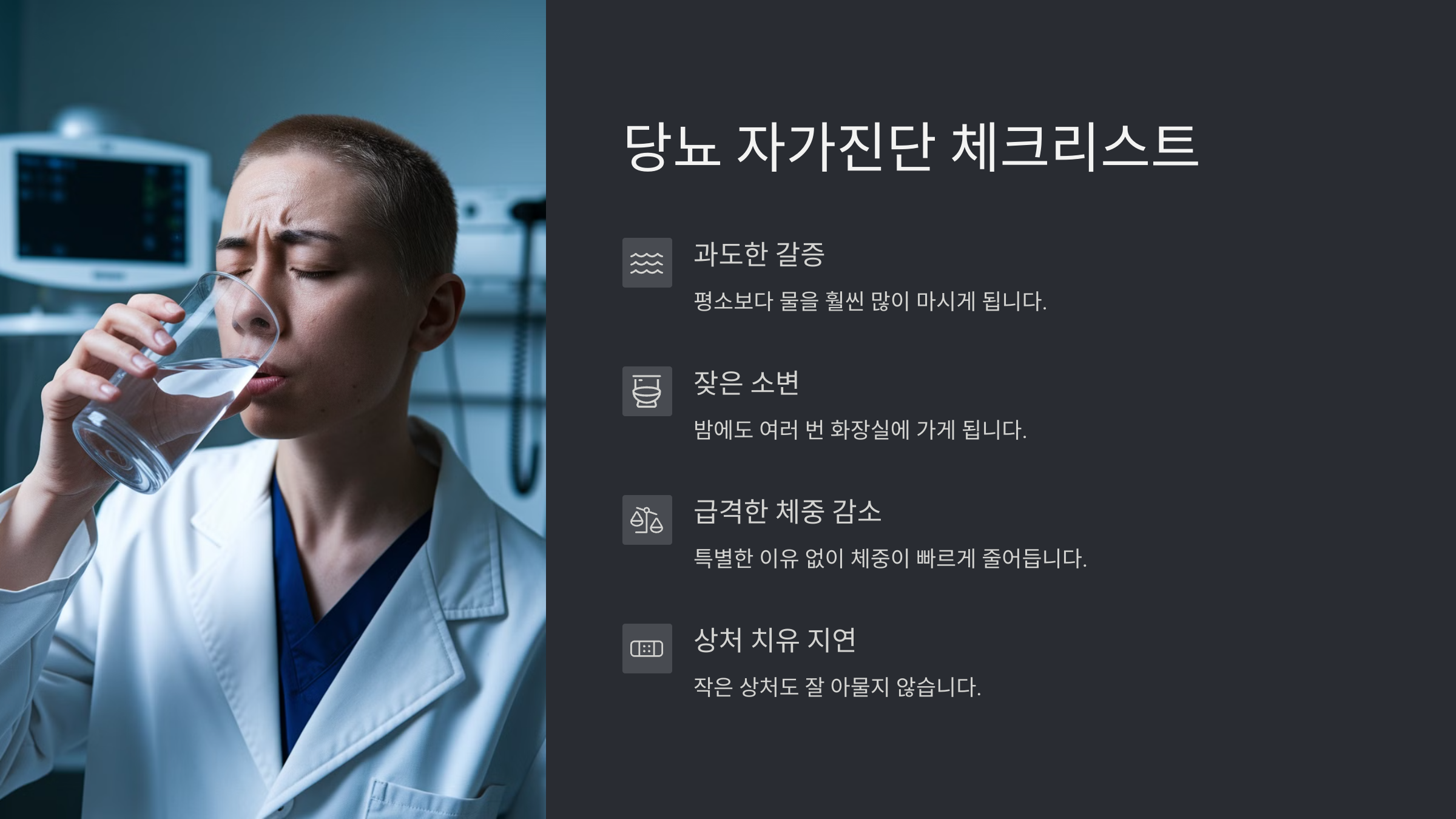 초기에는 뚜렷한 증상이 없는 경우도 많지만, 대표적인 초기 증상으로는 심한 갈증, 잦은 소변, 지속적인 피로감이 있어요. 물을 자주 마시고 화장실을 자주 간다면 몸이 혈당을 조절하지 못해 과잉 포도당을 소변으로 배출하려고 하는 신호일 수 있어요.