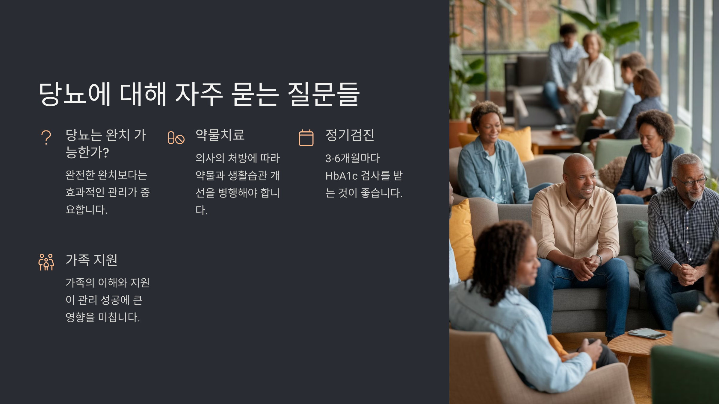 A5. 현재로선 완치보단 ‘평생 관리’의 개념이에요. 하지만 혈당을 정상 범위로 유지하면 건강한 삶을 살 수 있어요. 조기 발견이 정말 중요해요.