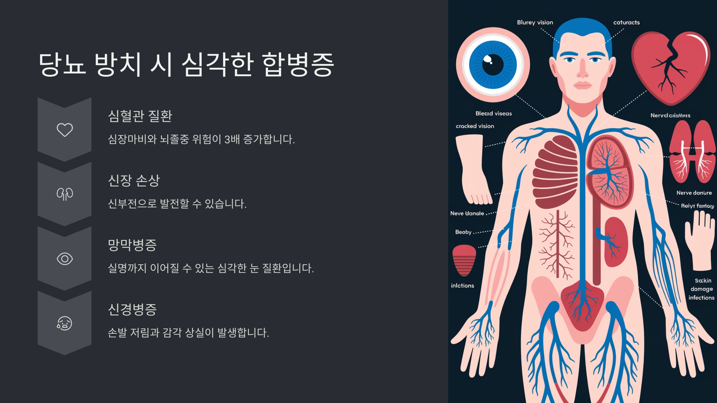 당뇨를 초기에 방치하면 다양한 합병증으로 이어질 수 있어요. 특히 고혈당 상태가 오랜 시간 지속되면 혈관과 신경이 손상되면서 신체 여러 기관에 문제를 일으켜요. 그래서 당뇨는 '조용한 살인자'라고 불리기도 해요.