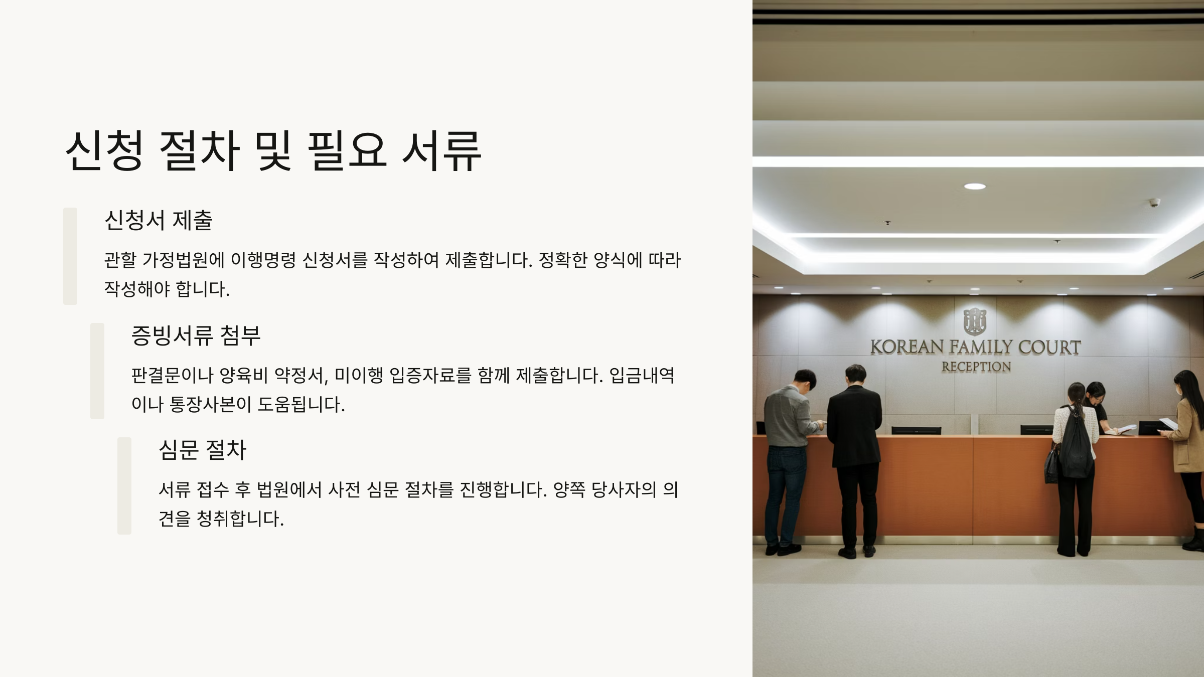 이 제도는 민사소송법상 ‘이행명령 제도’에 기반을 두고 있으며, 가사소송절차법 제63조에 따라 양육비 지급 판결 또는 조정, 약정된 합의문이 있는 경우에 활용할 수 있어요. 이 명령이 내려지면 정해진 기간 내에 양육비를 반드시 지급해야 해요.